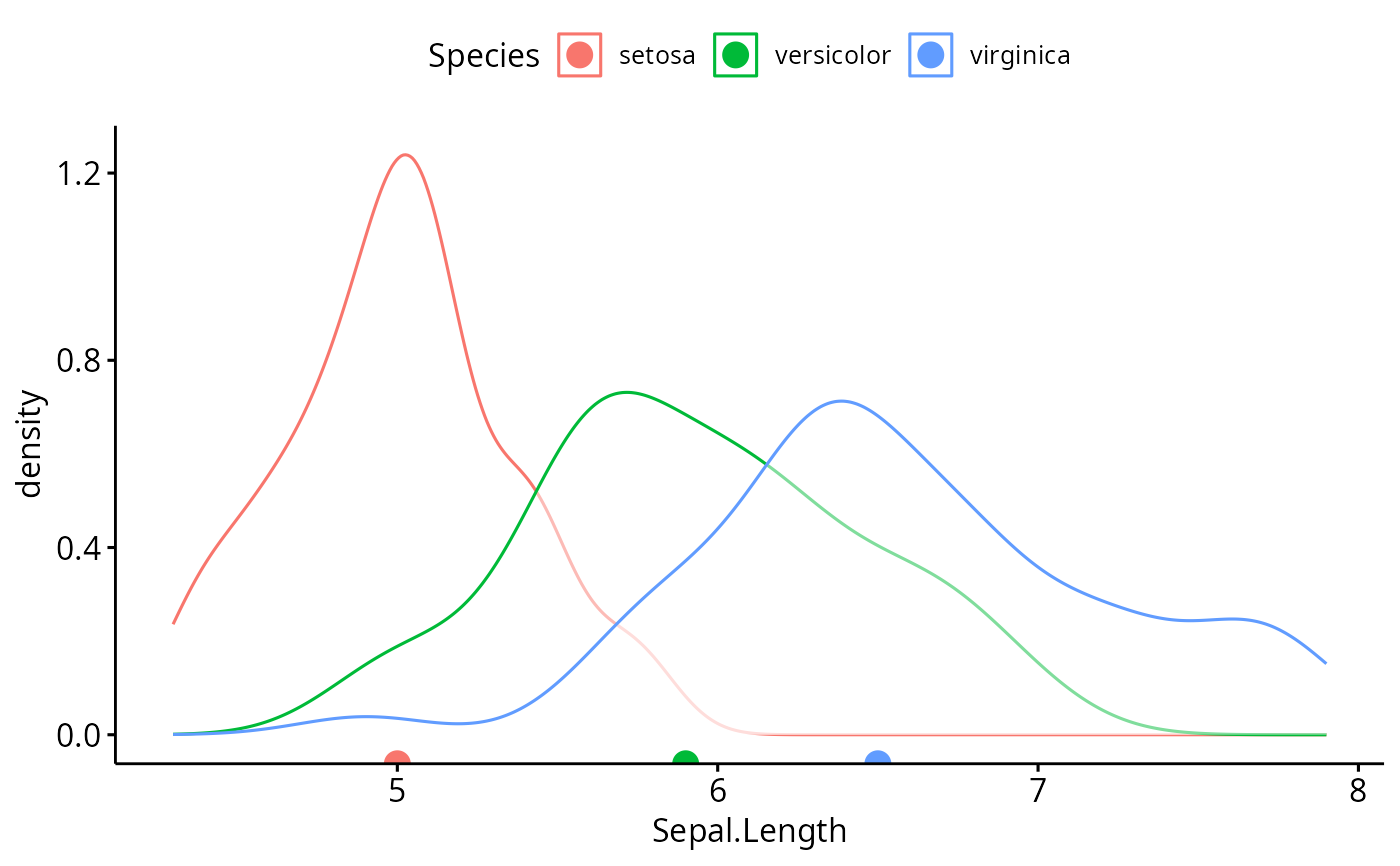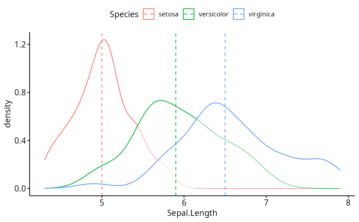 ggdensity(iris, "Sepal.Length", color = "Species") +
