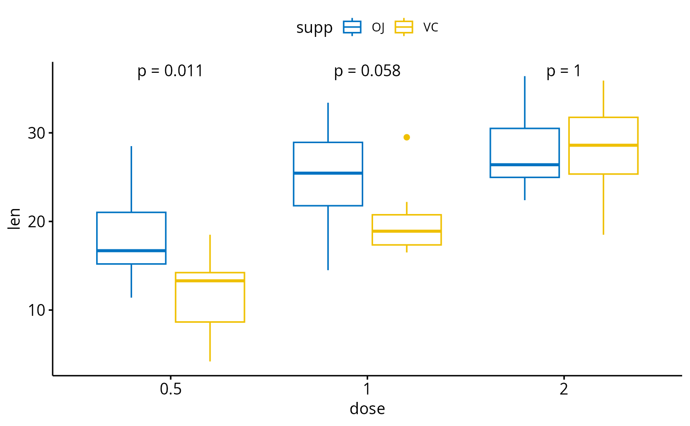 bxp + stat_friedman_test(aes(wid = id, group = supp, color = supp), within = "x")