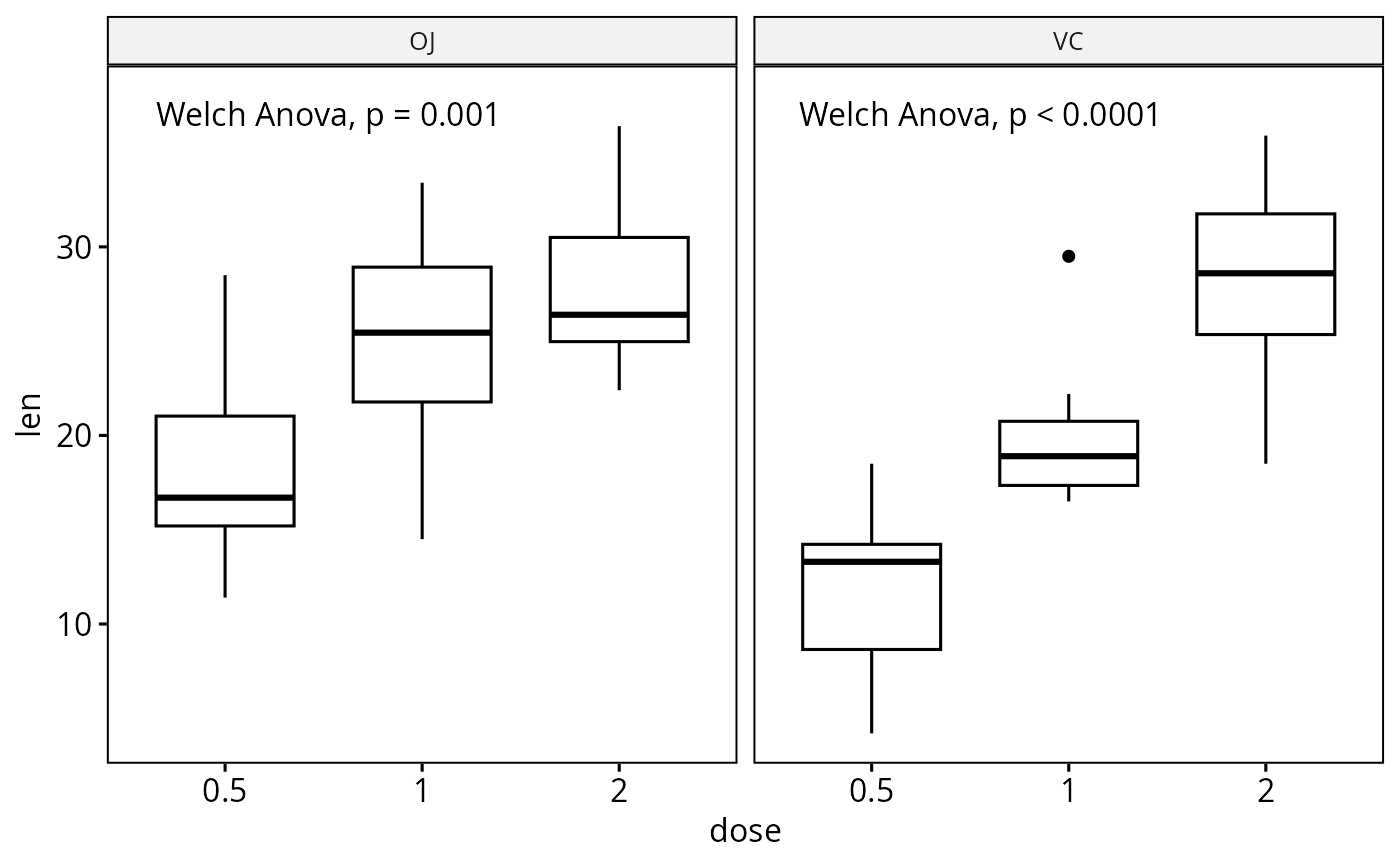 bxp2 + stat_welch_anova_test(aes(group = dose), label = "p = {p.format}{p.signif}")