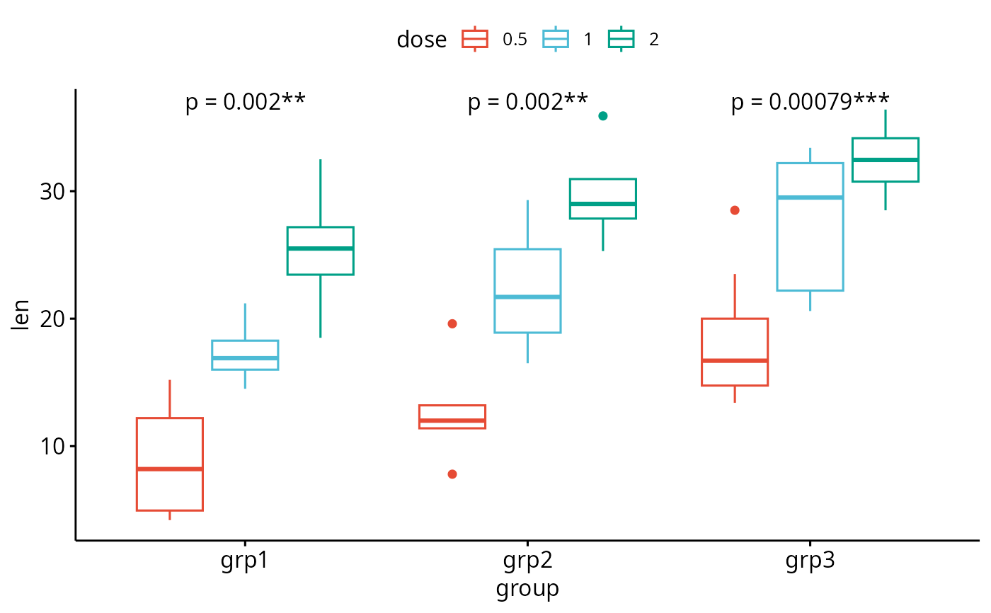 "x.var": Group by the x-axis variable and perform the test between legend groups. In other words, the p-value is compute between legend groups at each x position"legend.var": Group by the legend variable and perform the test between x-axis groups. In other words, the test is performed between the x-groups for each legend level.