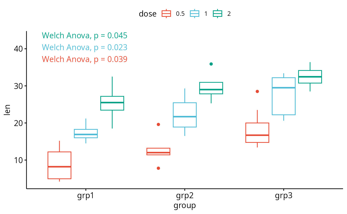 bxp2 + stat_welch_anova_test(aes(group = dose, color = dose), group.by = "legend.var")