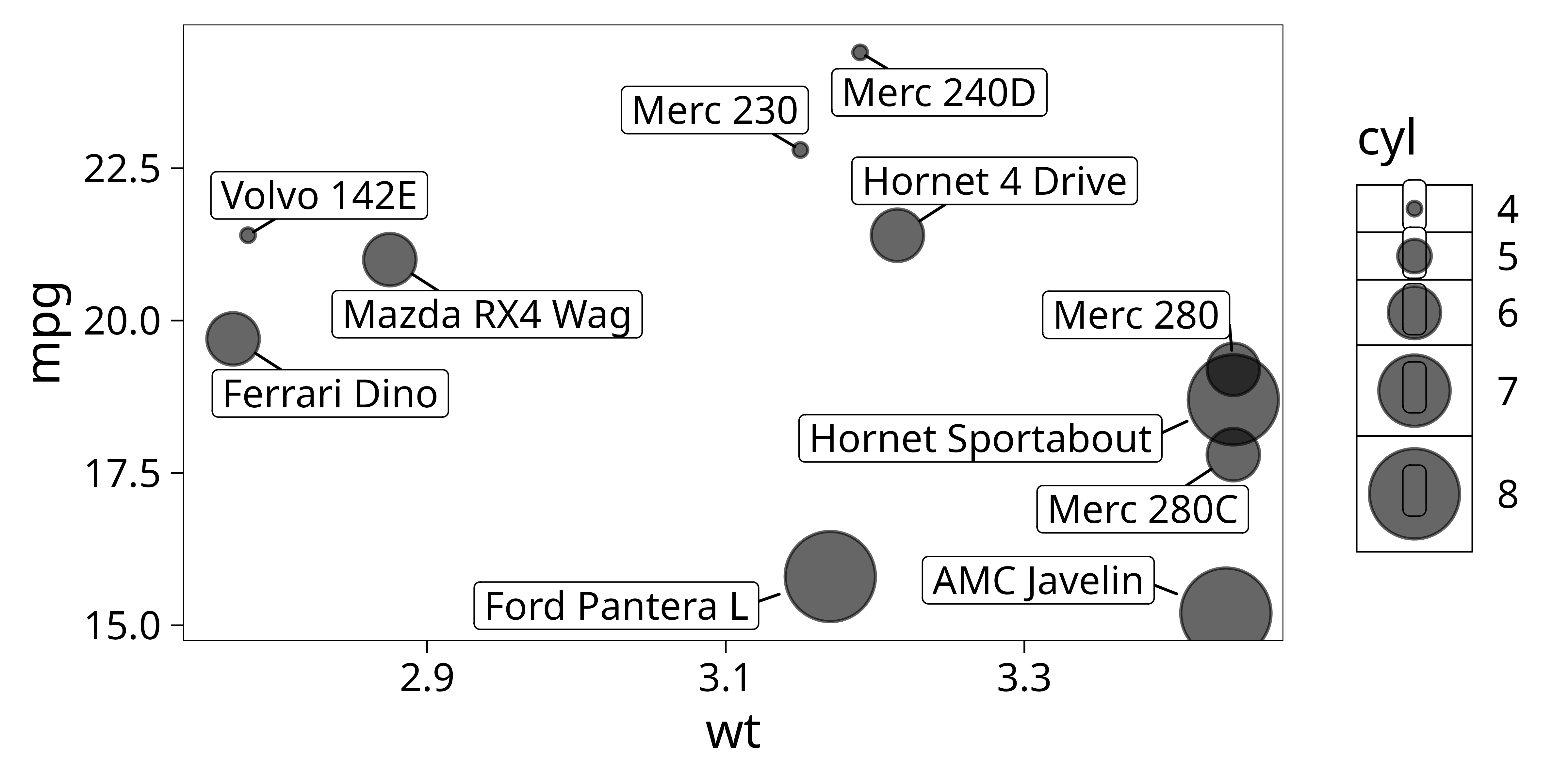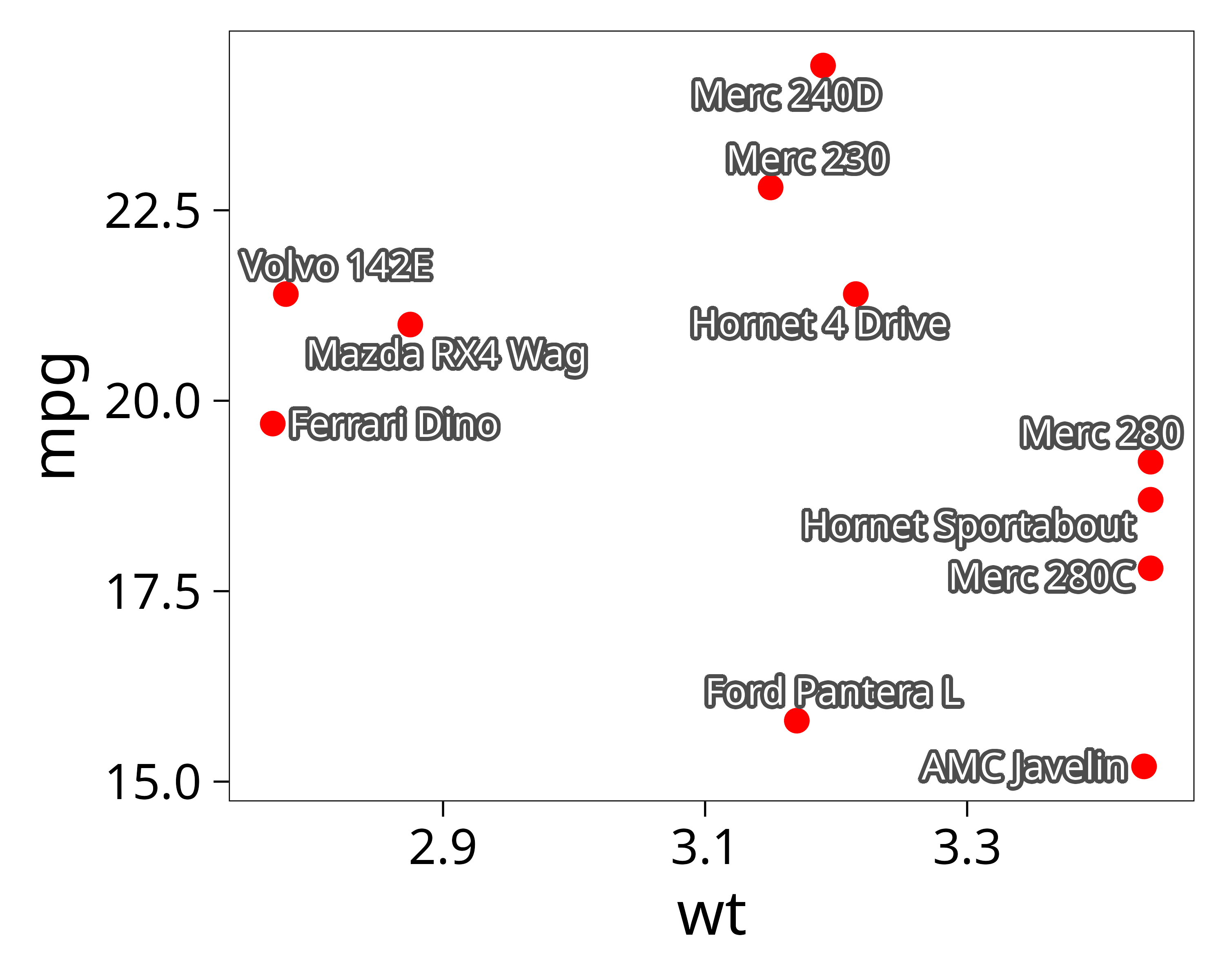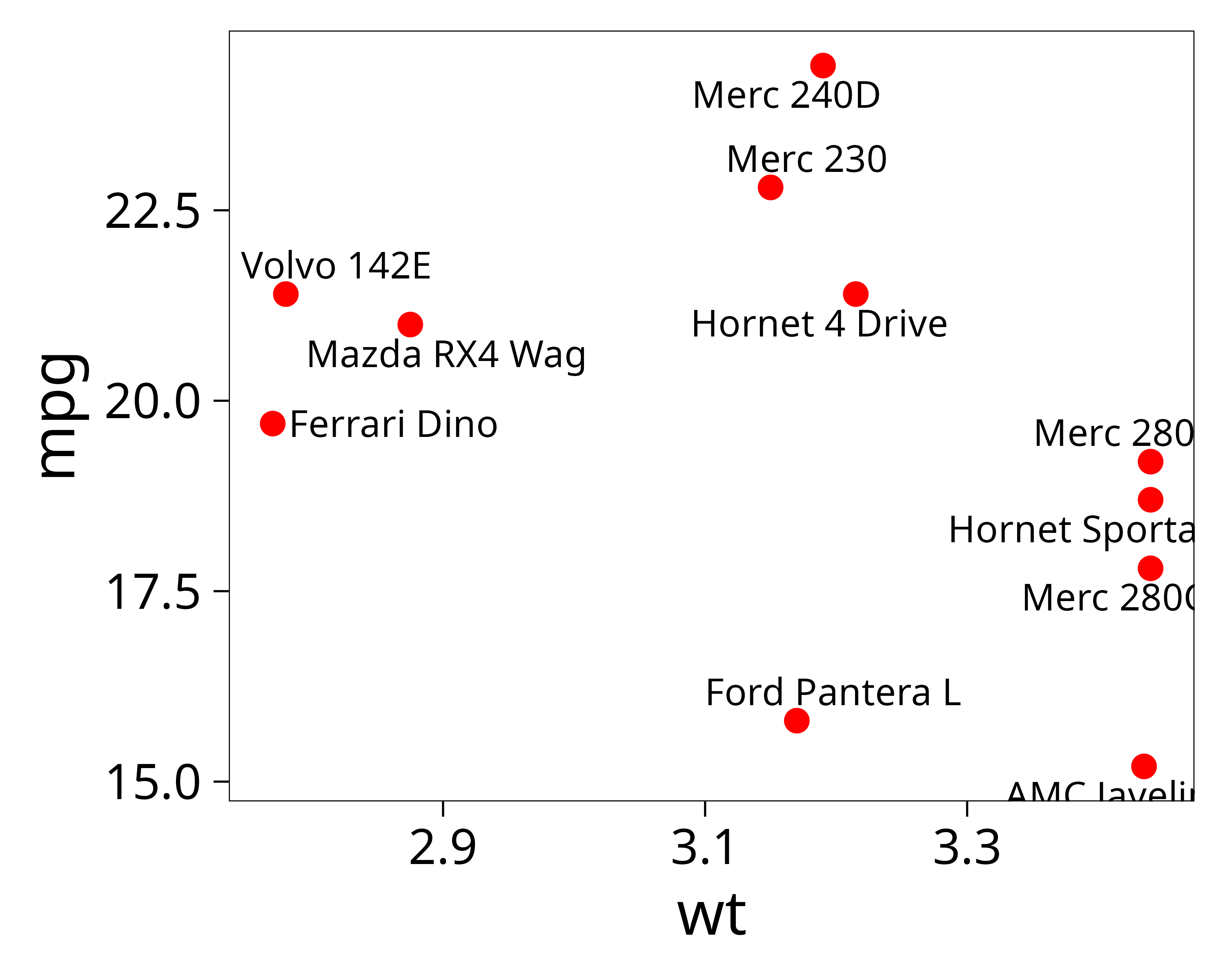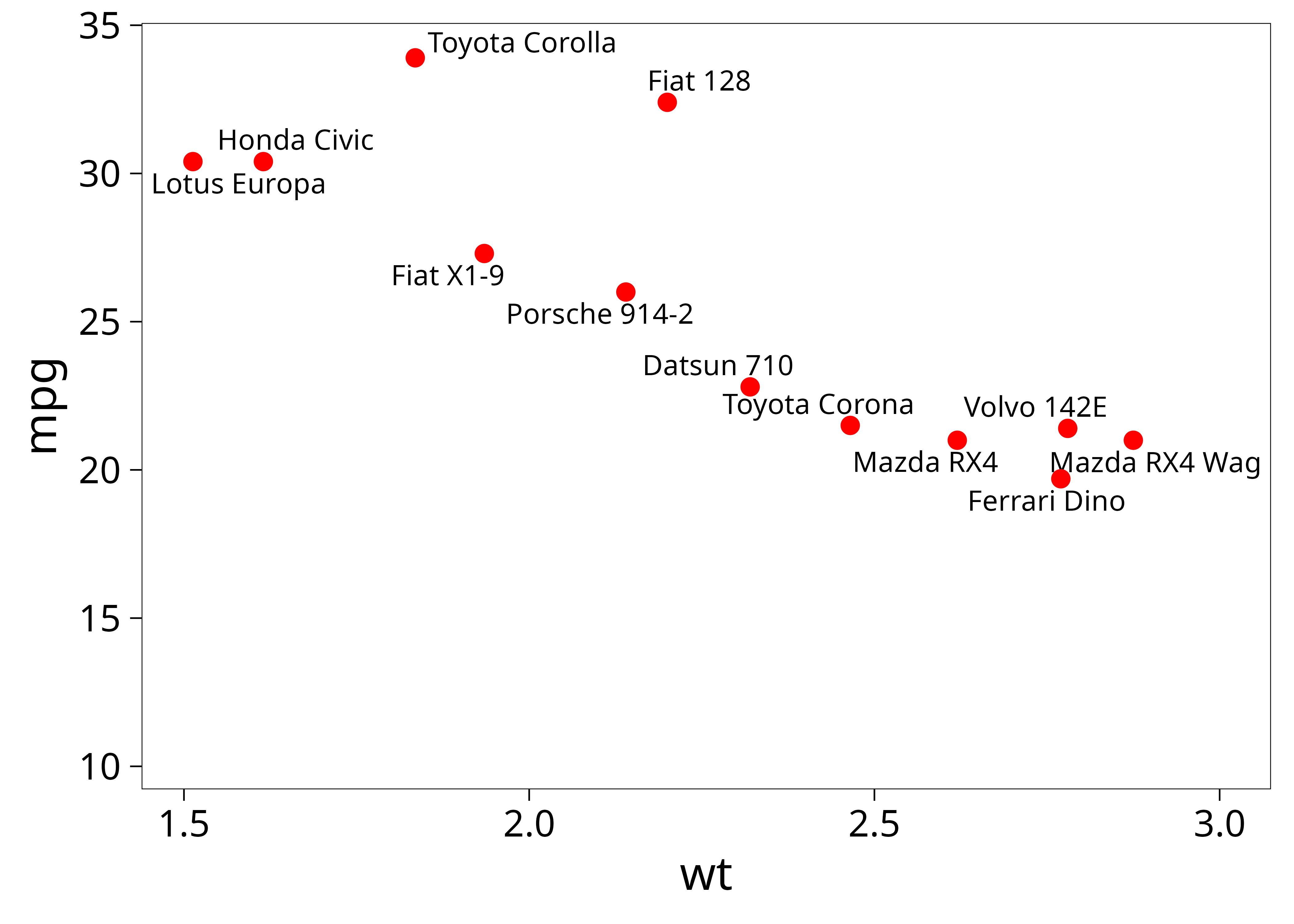 p <- ggplot(dat, aes(wt, mpg, label = car)) +