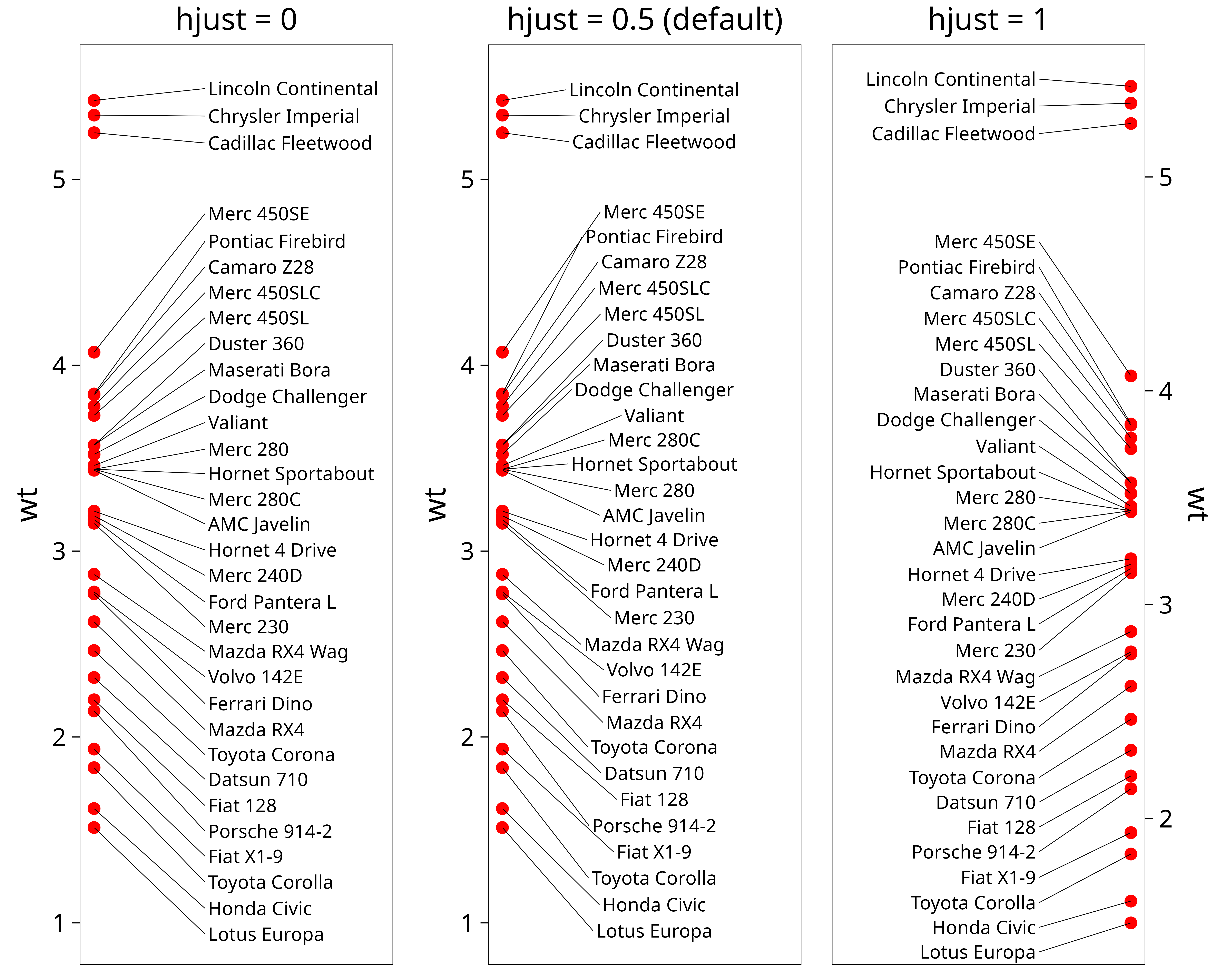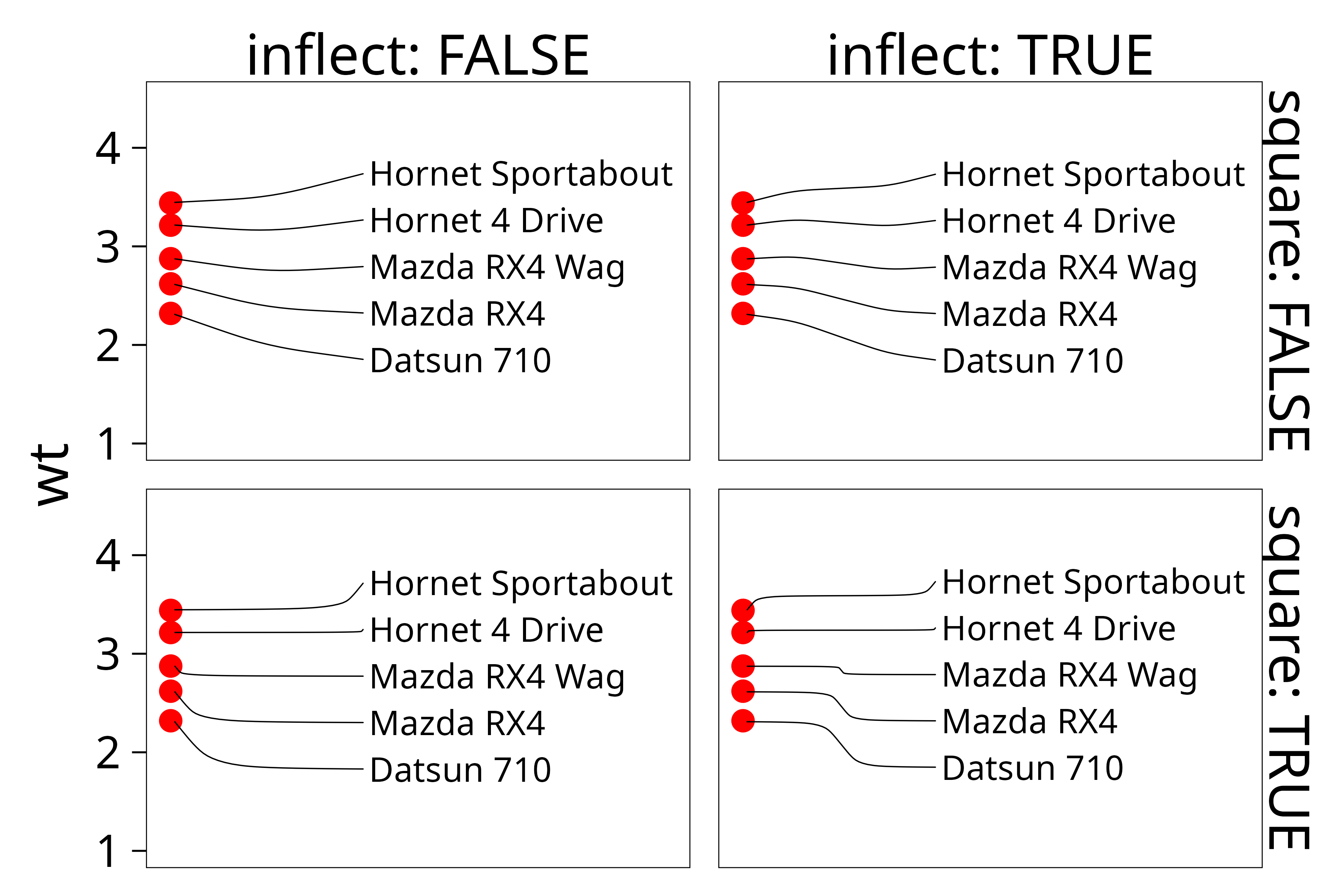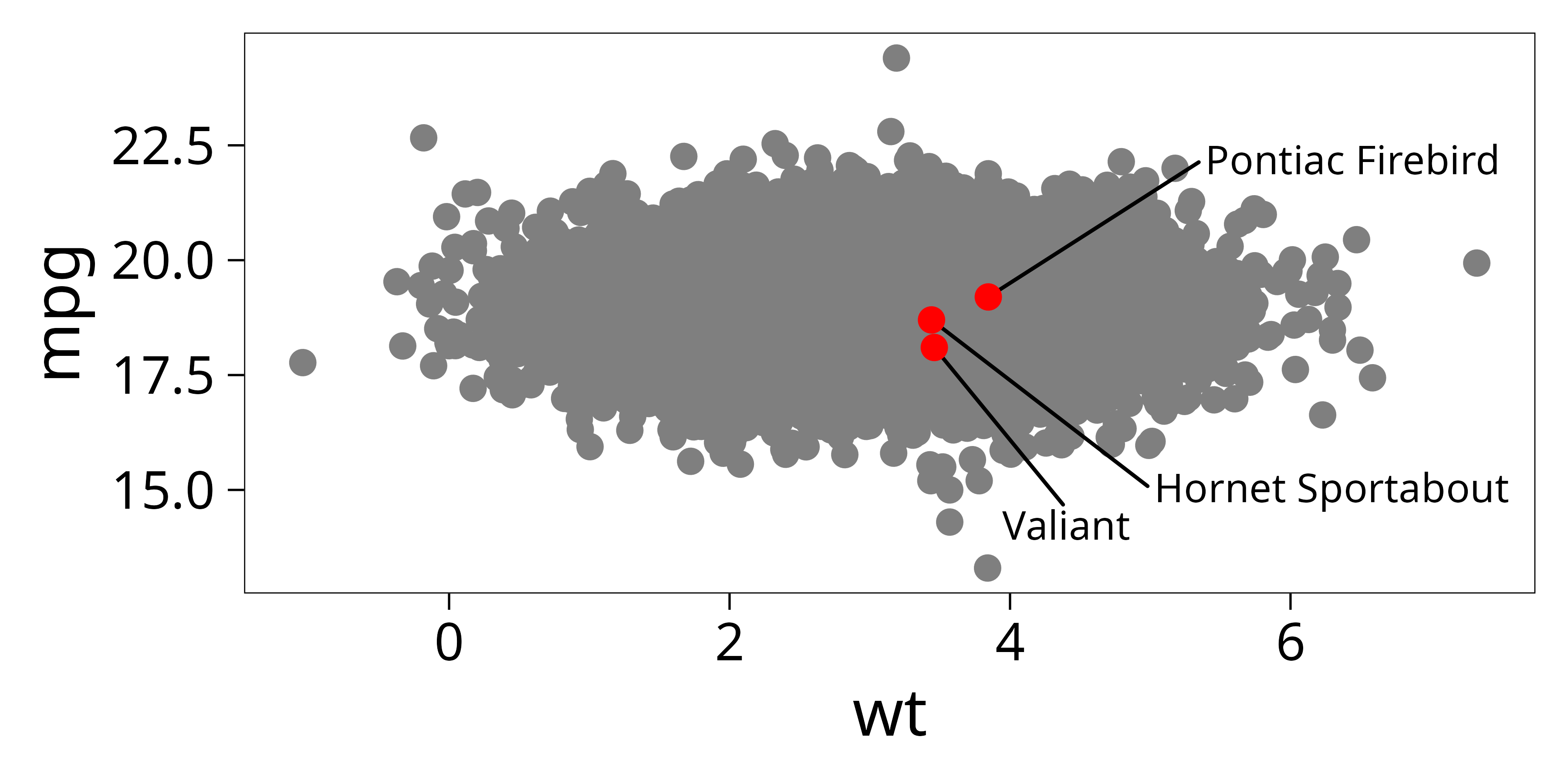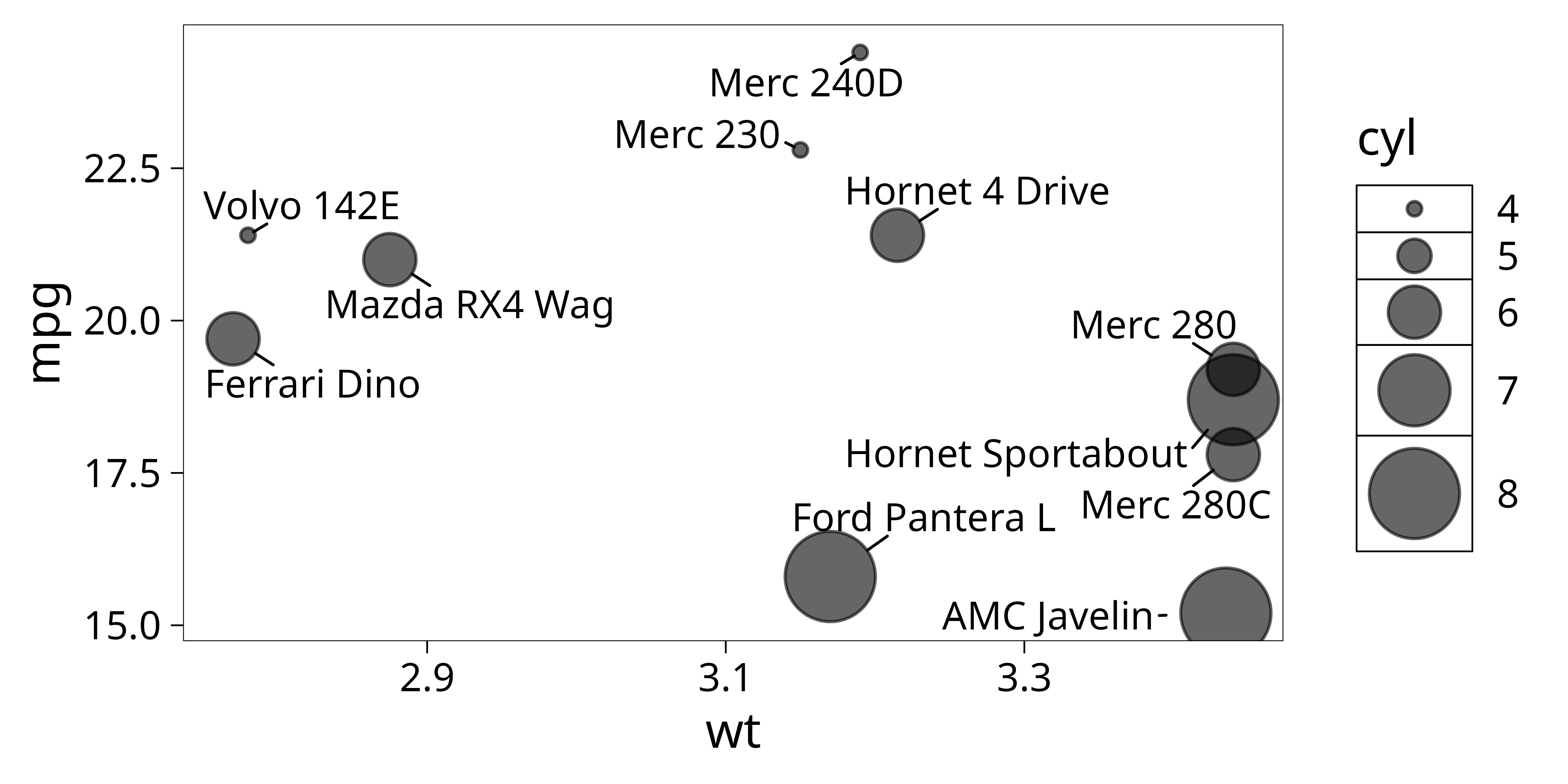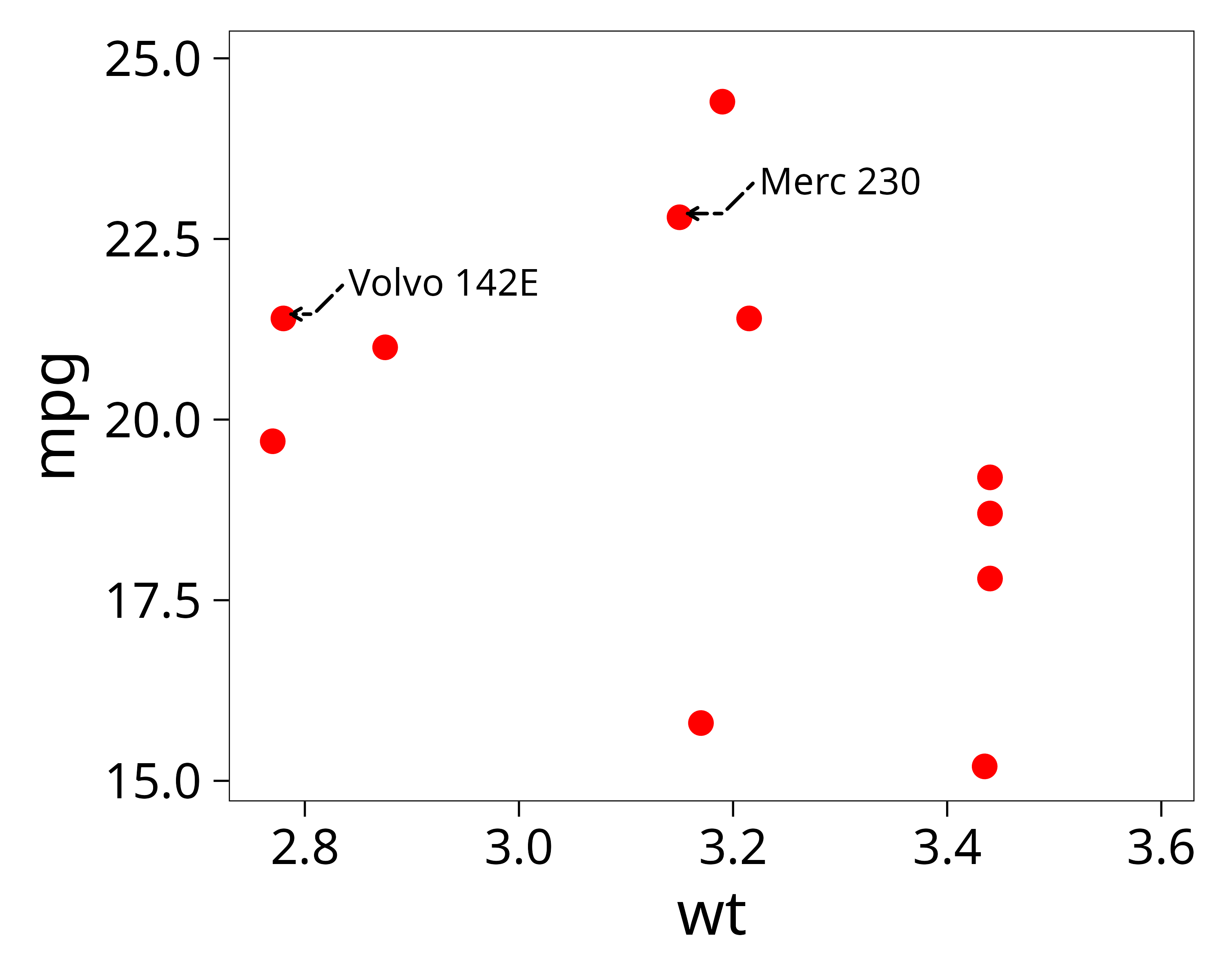 p <- ggplot(dat, aes(wt, mpg, label = car)) +