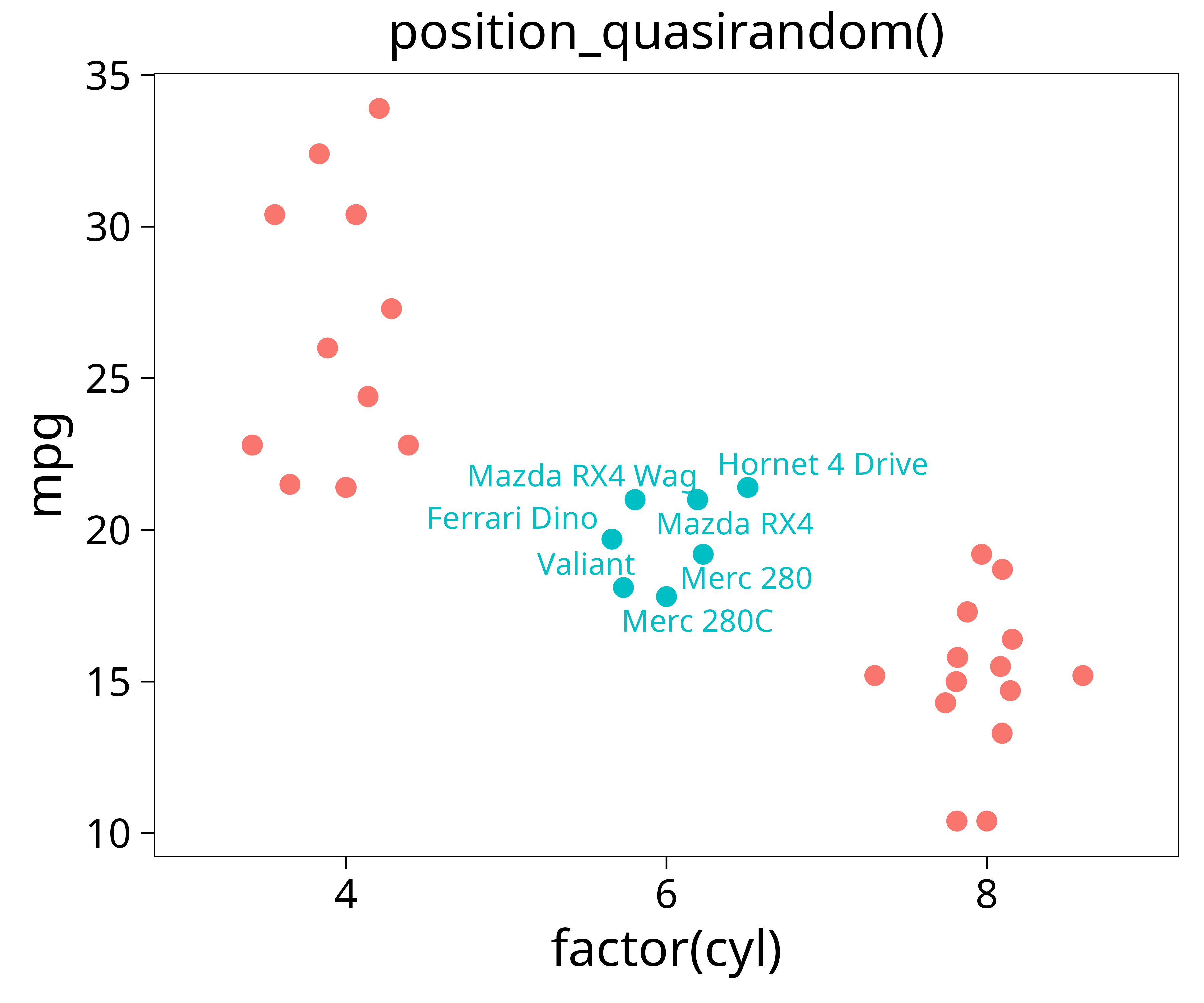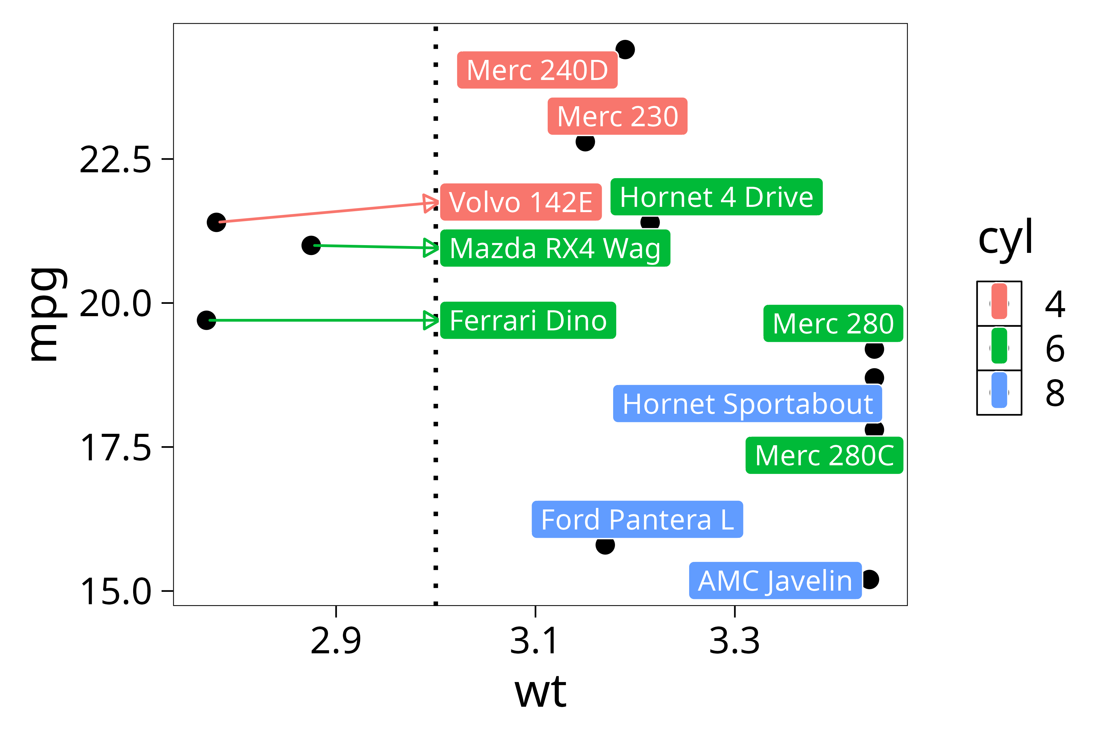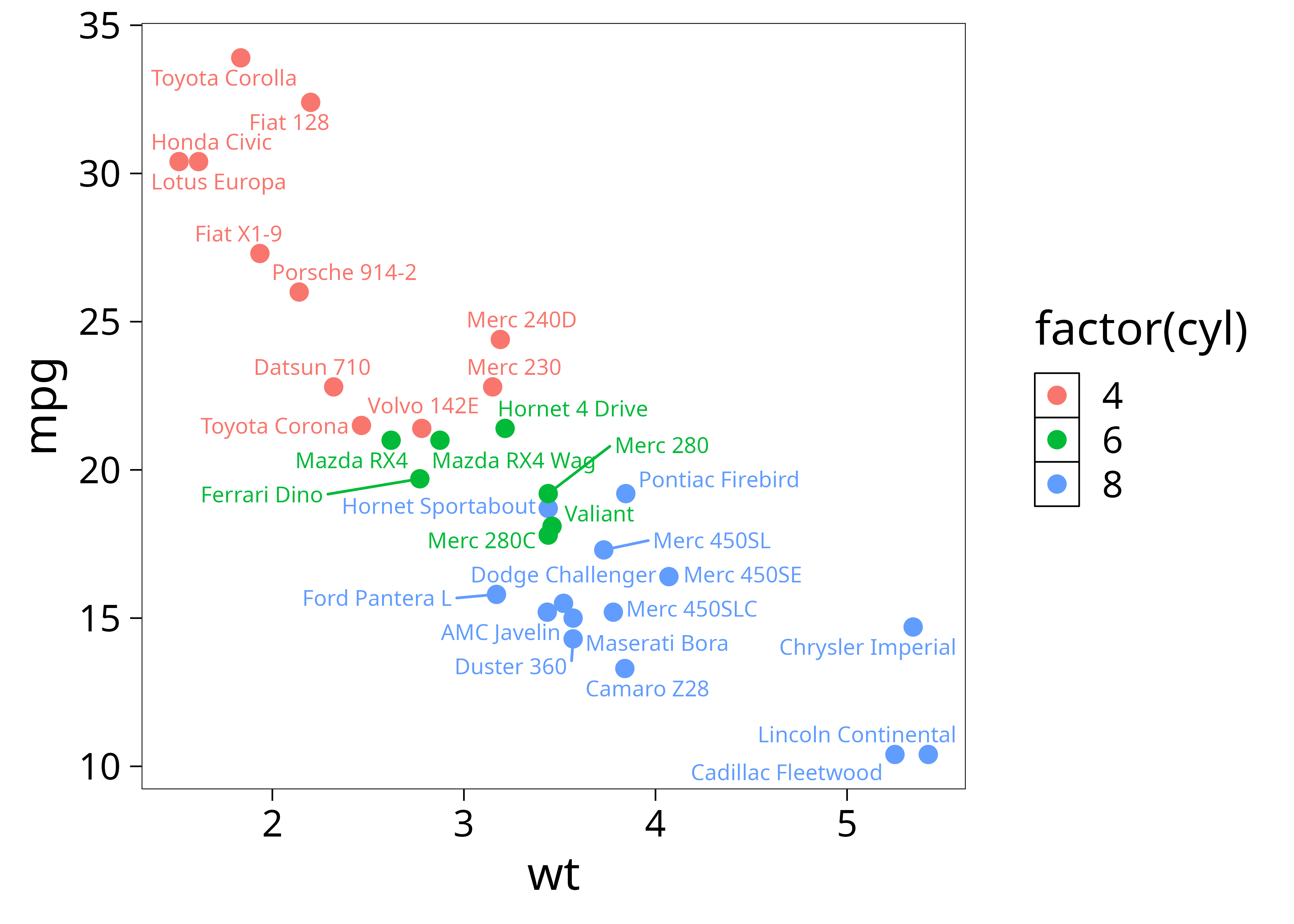 ggplot(mtcars, aes(x = wt, y = mpg, color = factor(cyl), label = label)) +