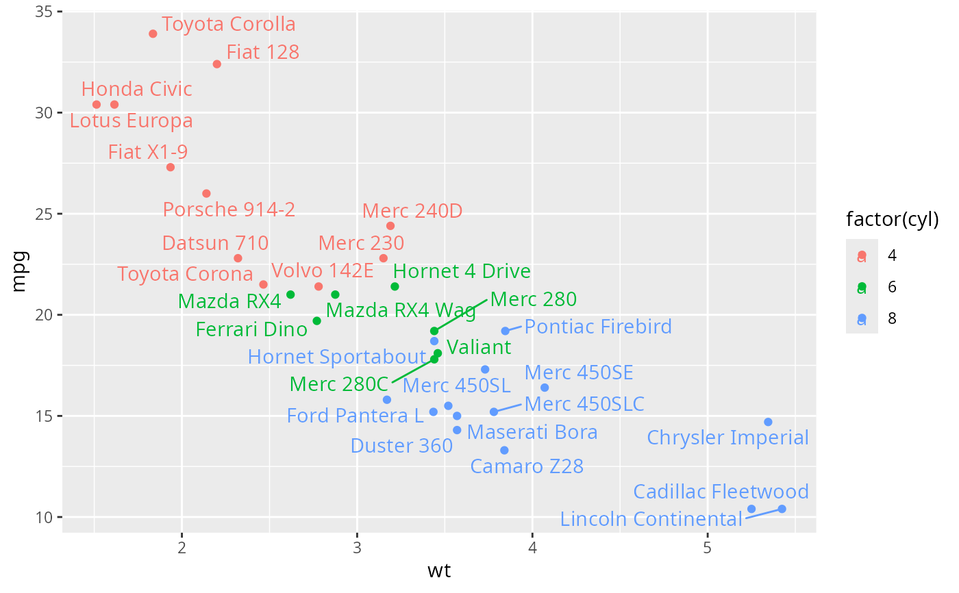 p + geom_text_repel(nudge_x = ifelse(mtcars$cyl == 6, 1, 0),