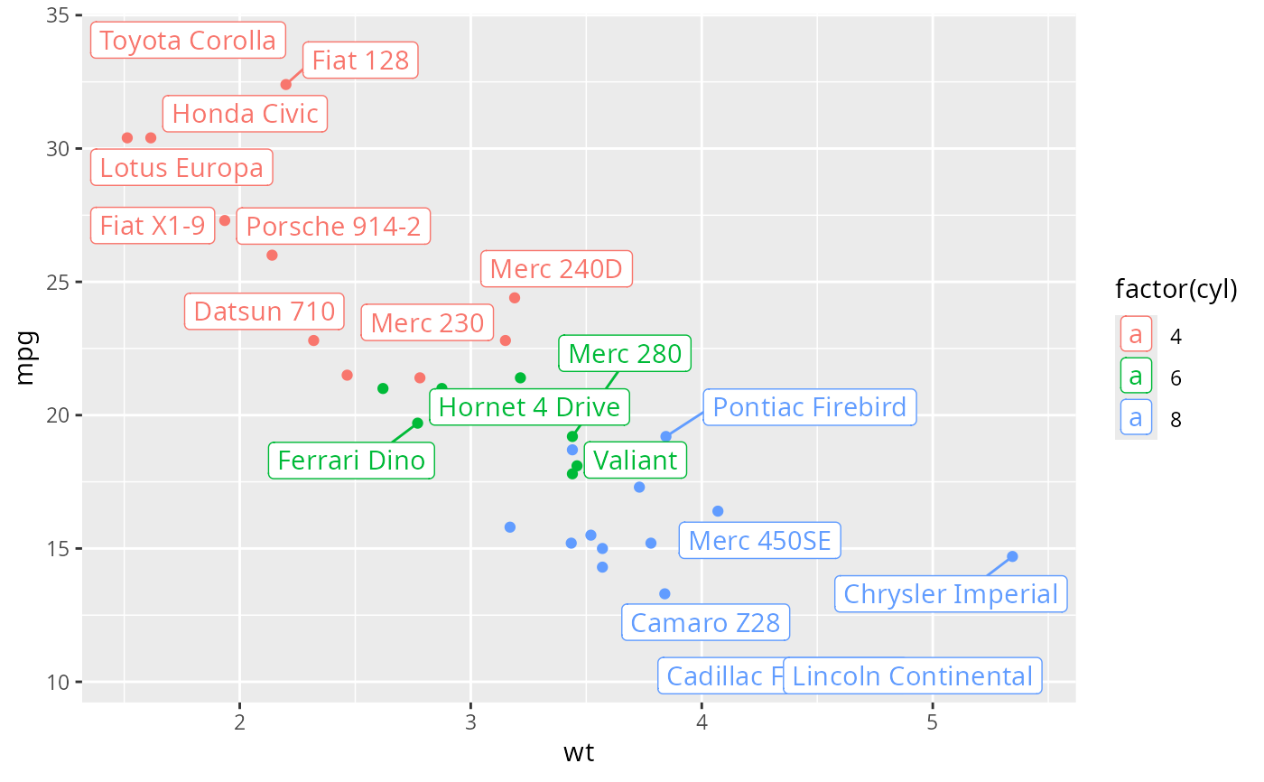 p + geom_label_repel(aes(fill=factor(cyl)), colour="white", segment.colour="black")