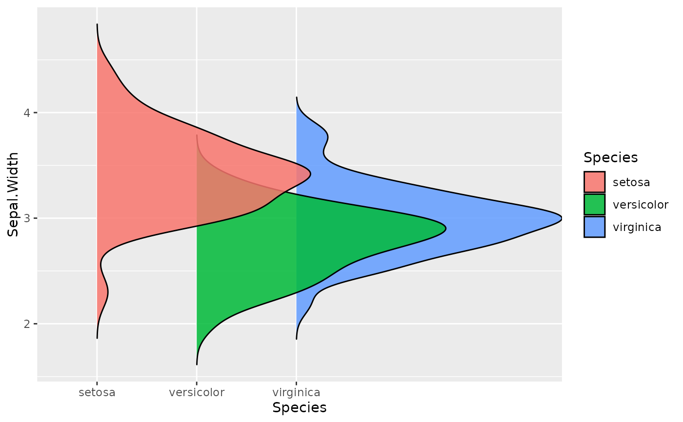 ggplot(iris, aes(x=Species, y=Sepal.Width, width = after_stat(density), fill=Species)) +