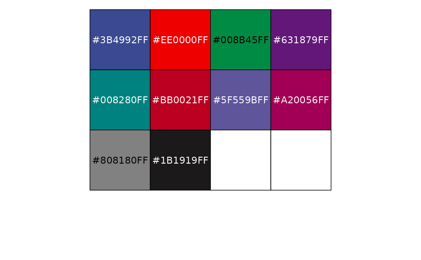 pal_aaas(palette = c("default"), alpha = 1)Palette type.
