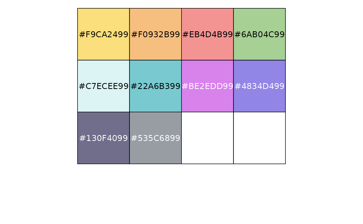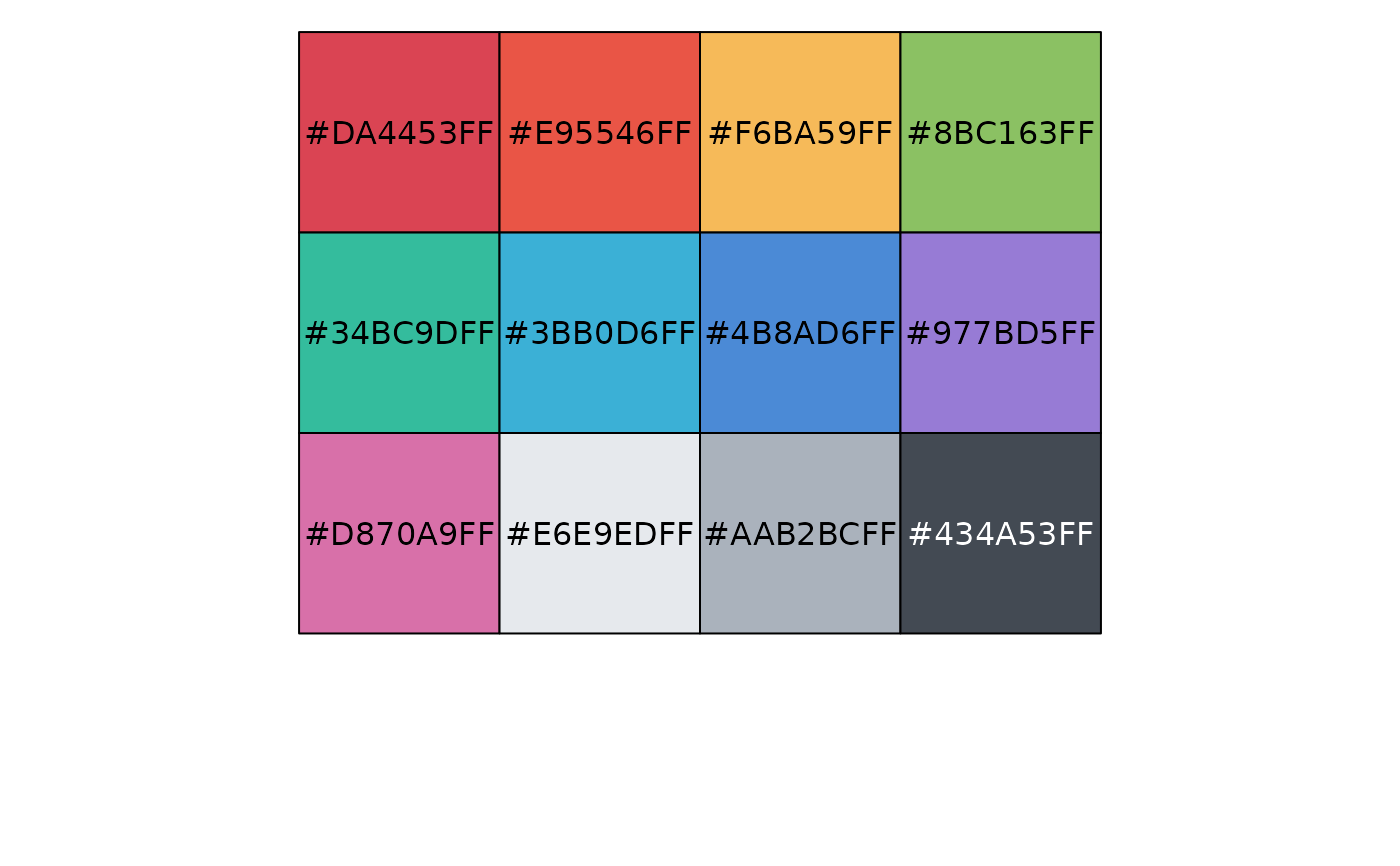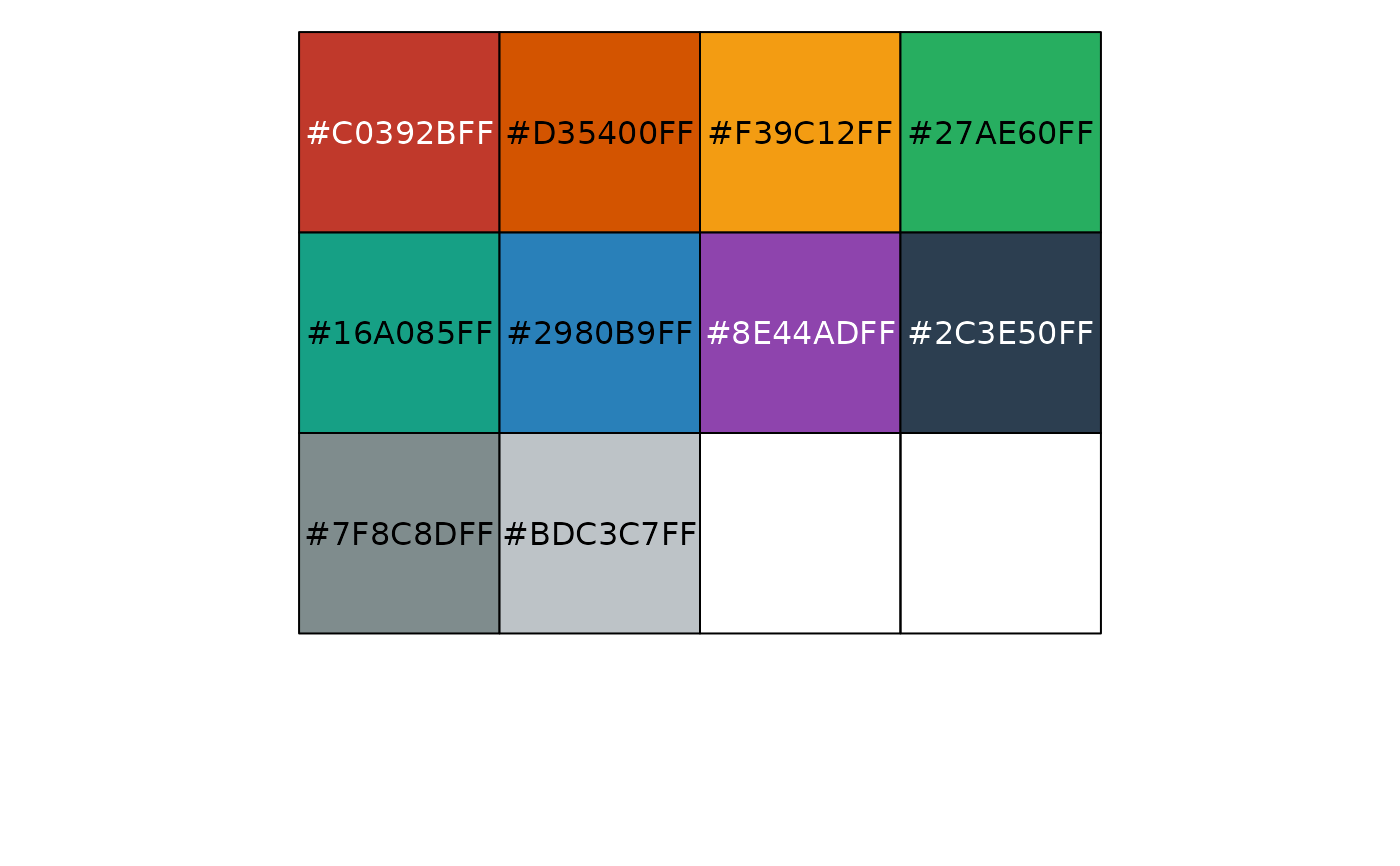 pal_flatui(palette = c("default", "flattastic", "aussie"), alpha = 1)Palette type. Currently there are three available options:
