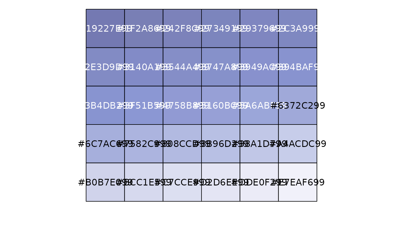 show_col(pal_material("indigo", n = 30, alpha = 0.6, reverse = TRUE)(30))