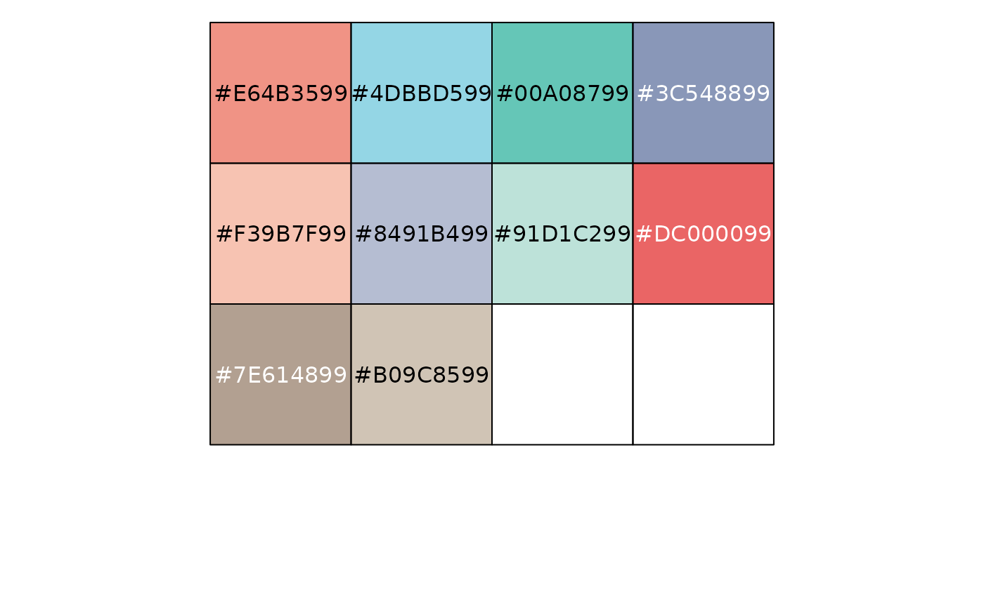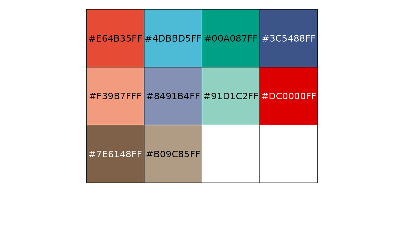pal_npg(palette = c("nrc"), alpha = 1)Palette type.
