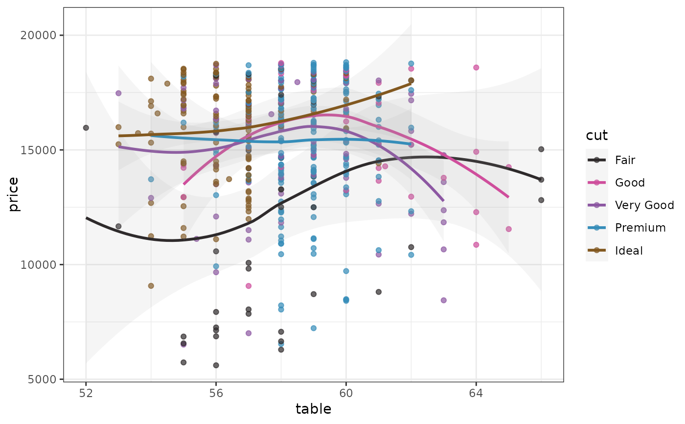 aes(x = table, y = price, colour = cut)