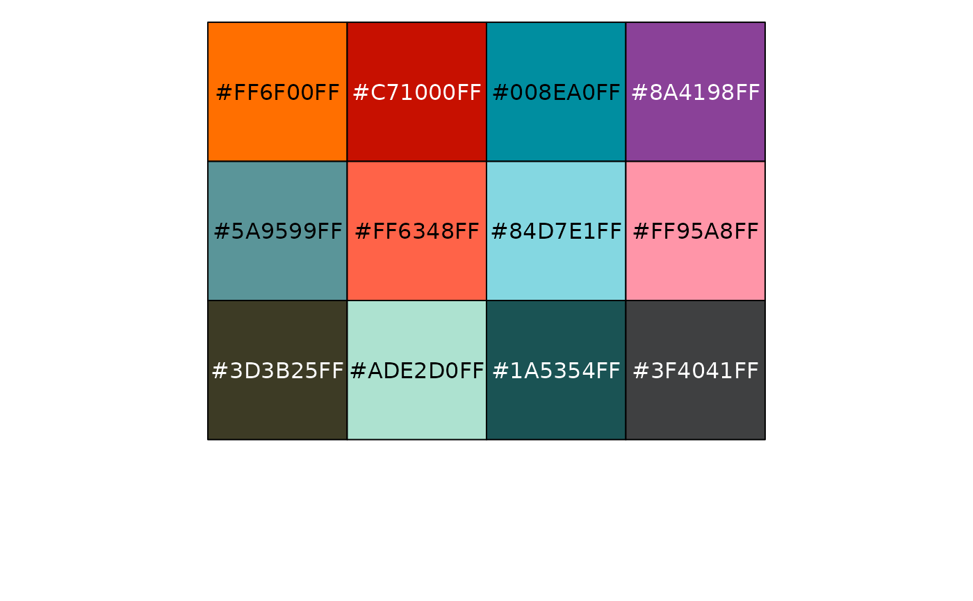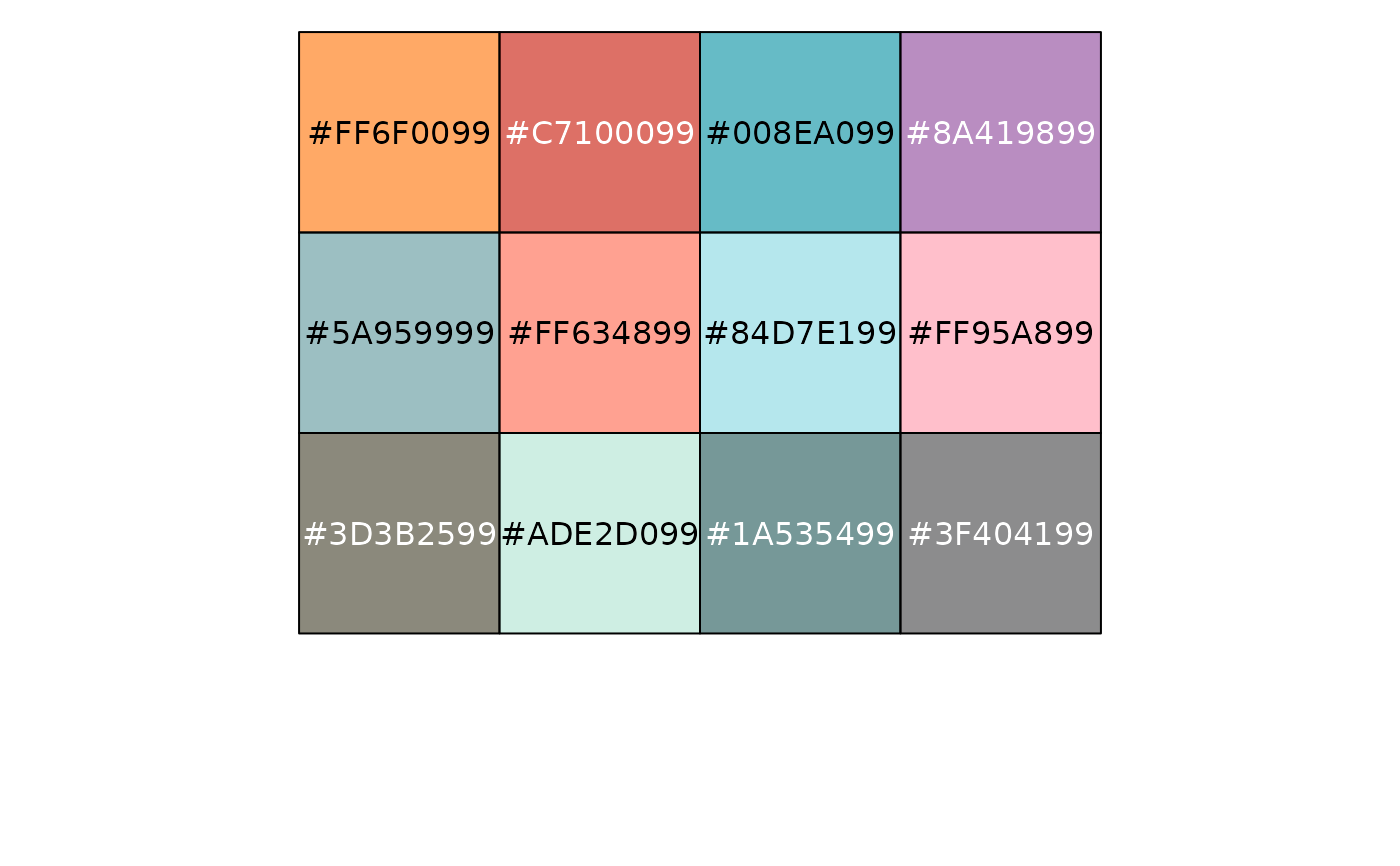 show_col(pal_futurama("planetexpress", alpha = 0.6)(12))