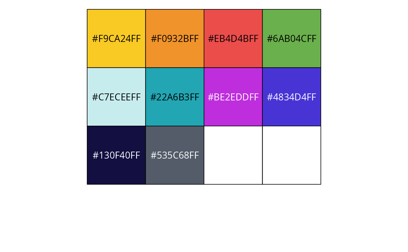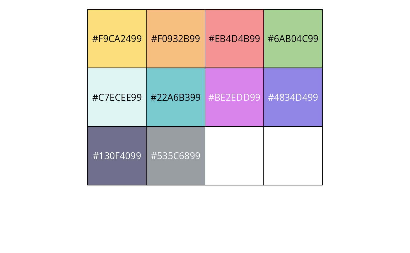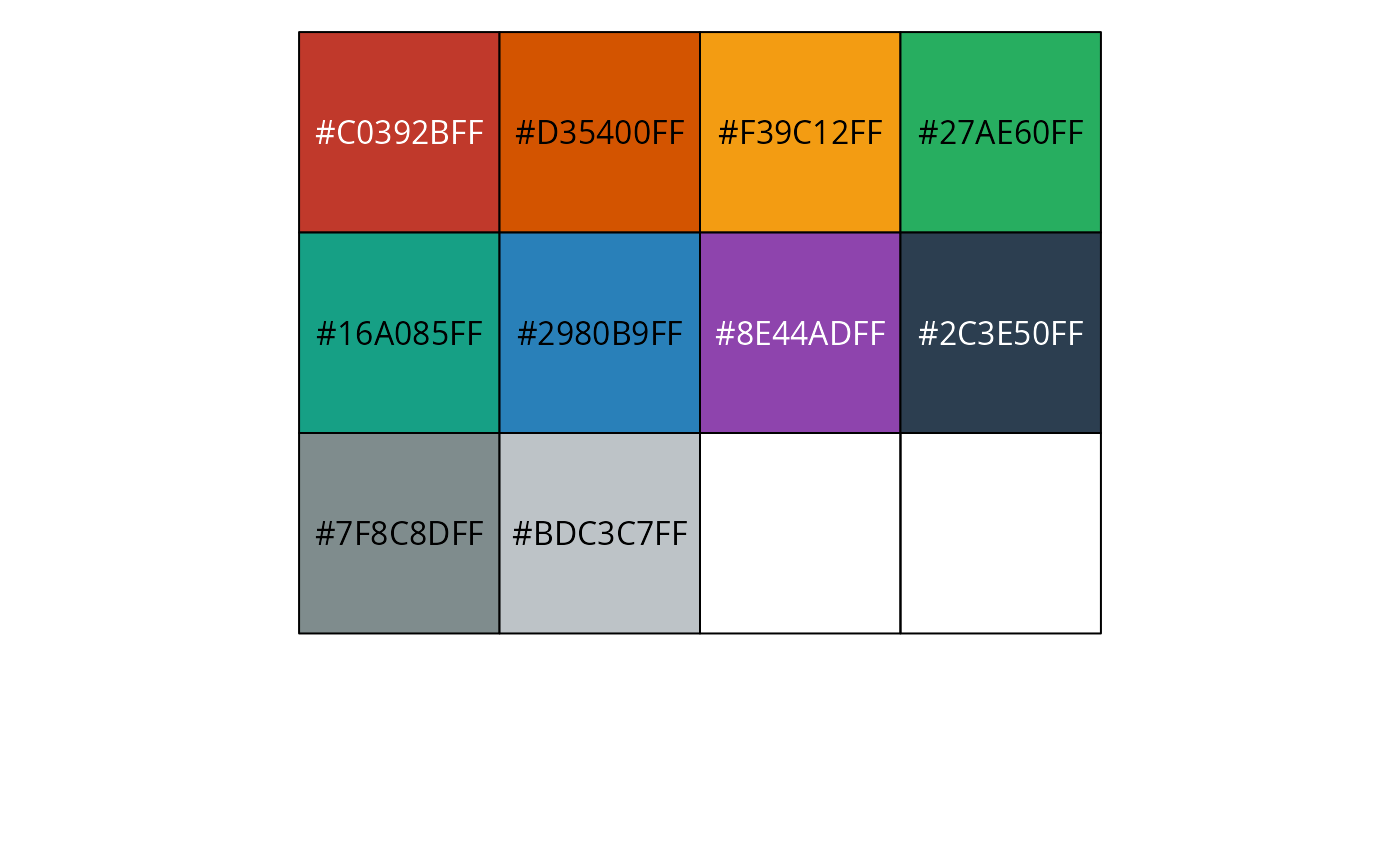 "default"(10-color palette)."flattastic"(12-color palette)."aussie"(10-color palette).