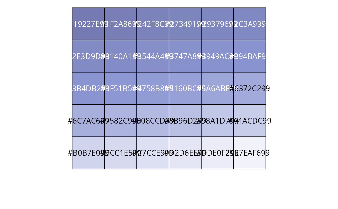 show_col(pal_material("indigo", n = 30, alpha = 0.6, reverse = TRUE)(30))