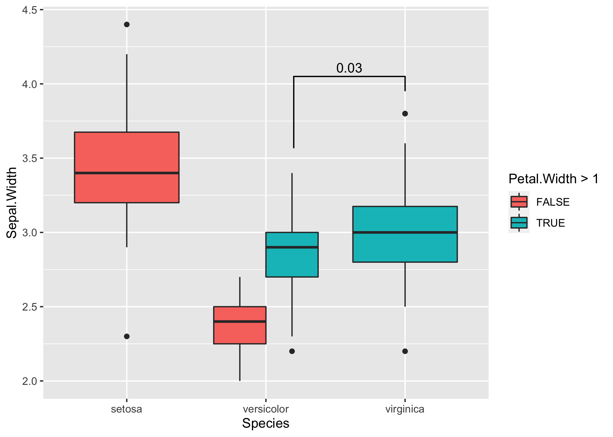 ggplot(iris, aes(x = Species, y = Sepal.Width, fill = Petal.Width > 1)) +