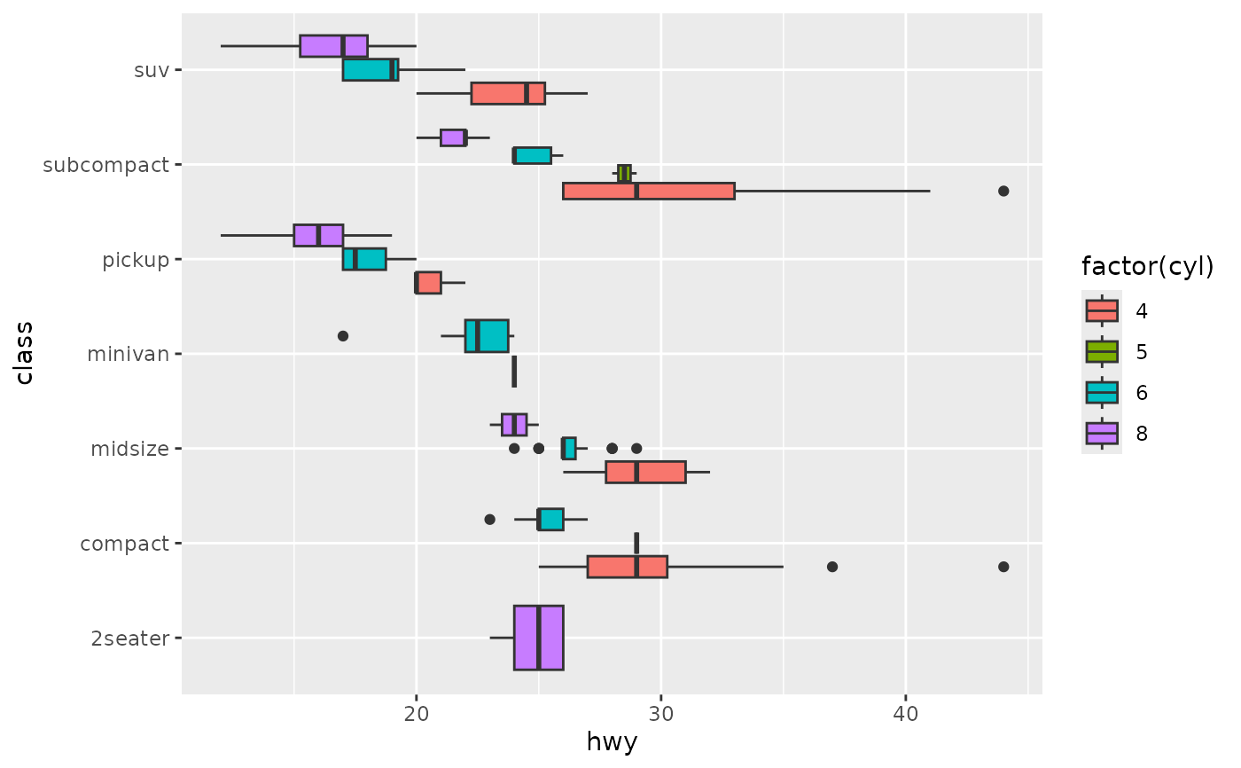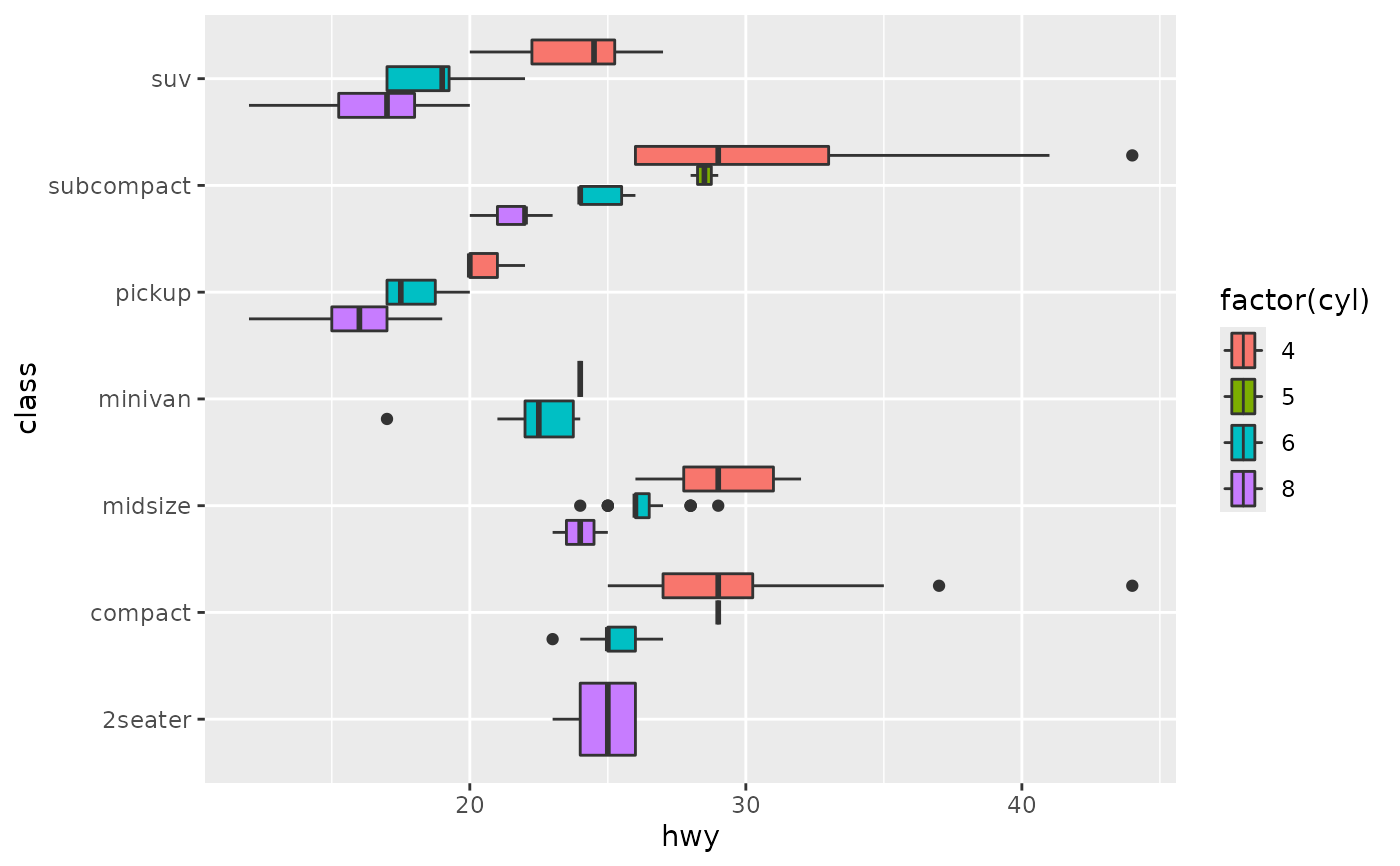 ggplot(mpg, aes(class, hwy, fill = factor(cyl))) +