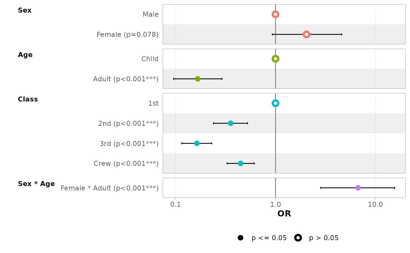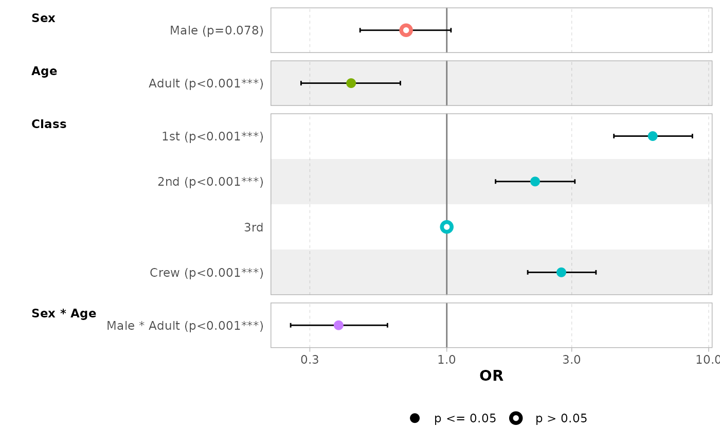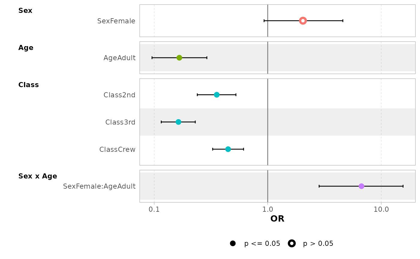 In the case of a logistic regression (or any other model for which coefficients are usually exponentiated), simply indicated exponentiate = TRUE. Note that a logarithmic scale will be used for the x-axis.