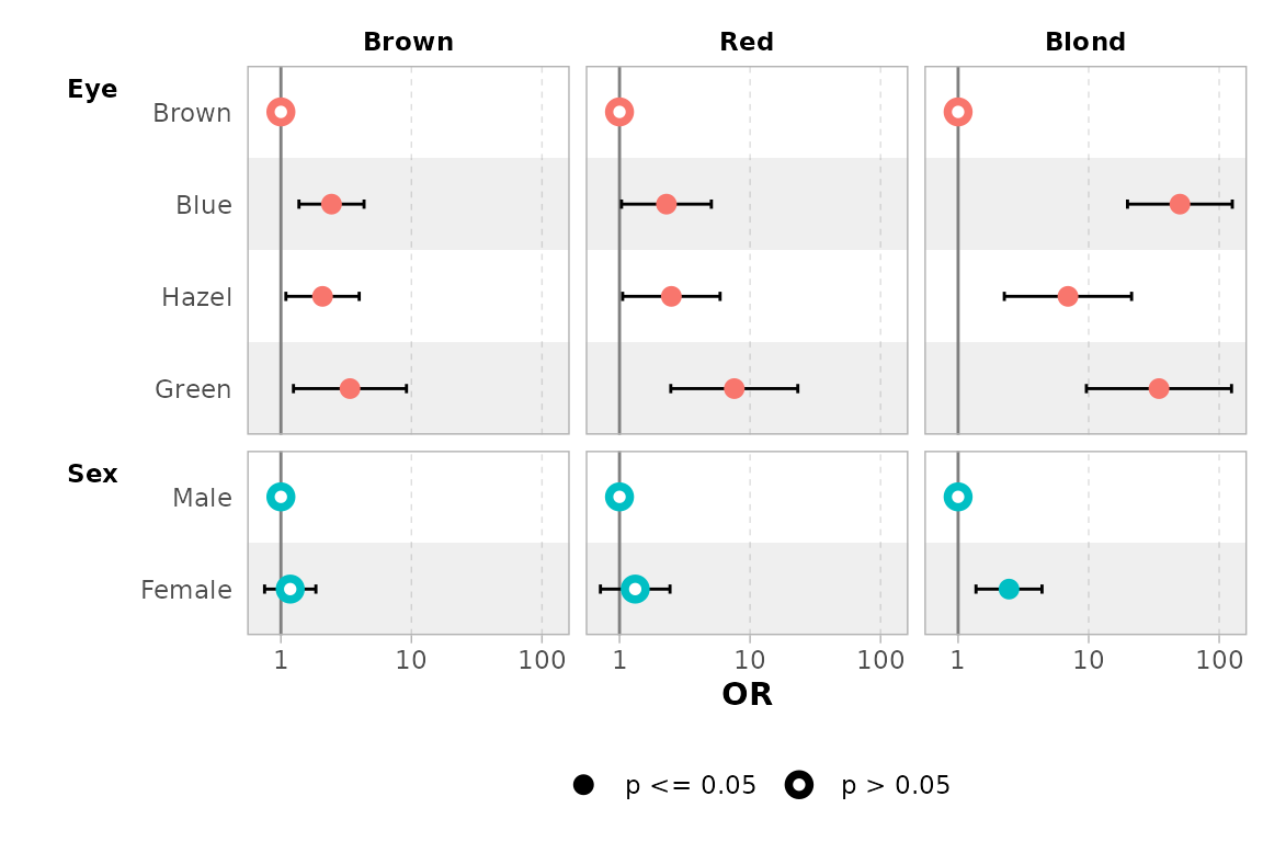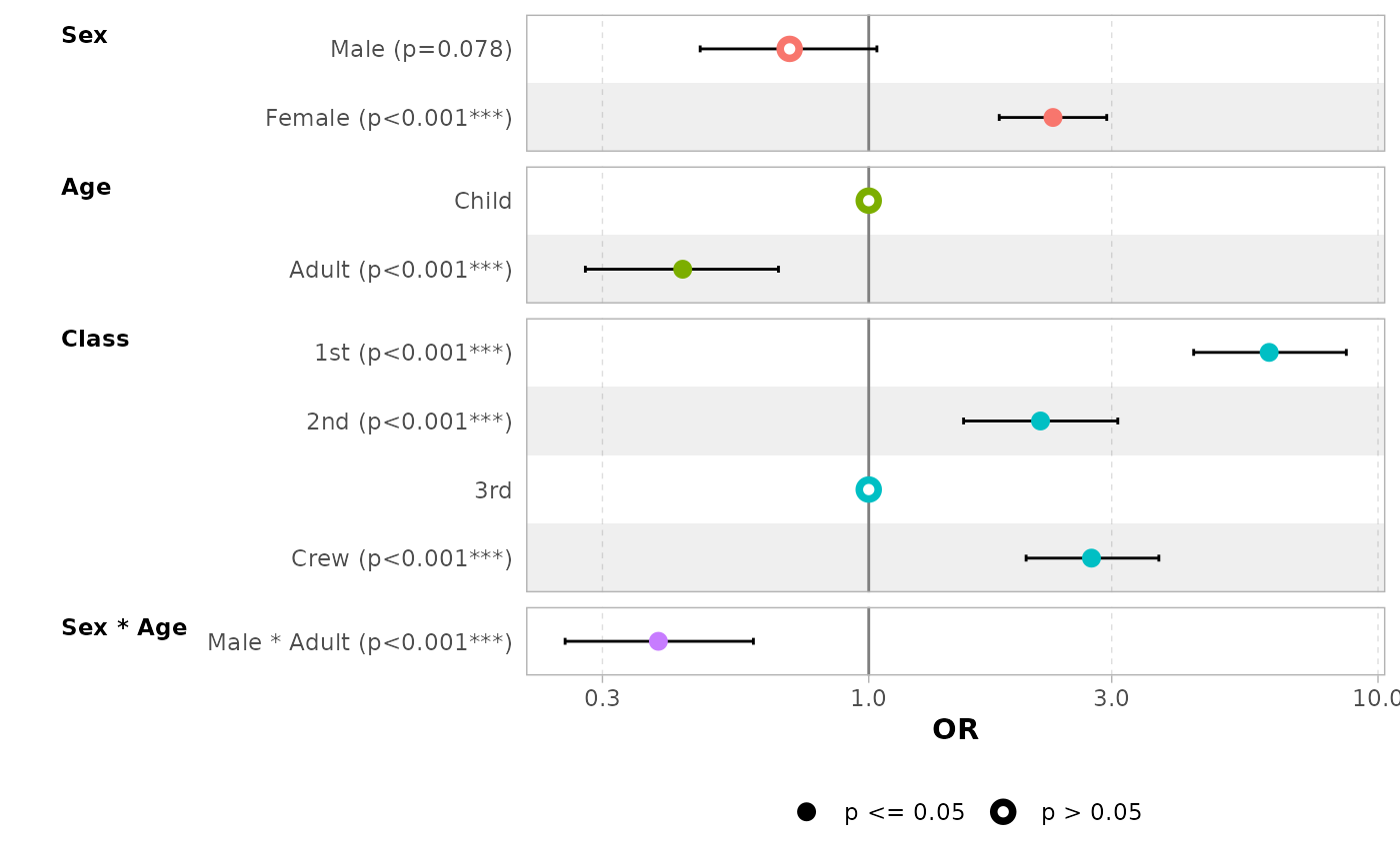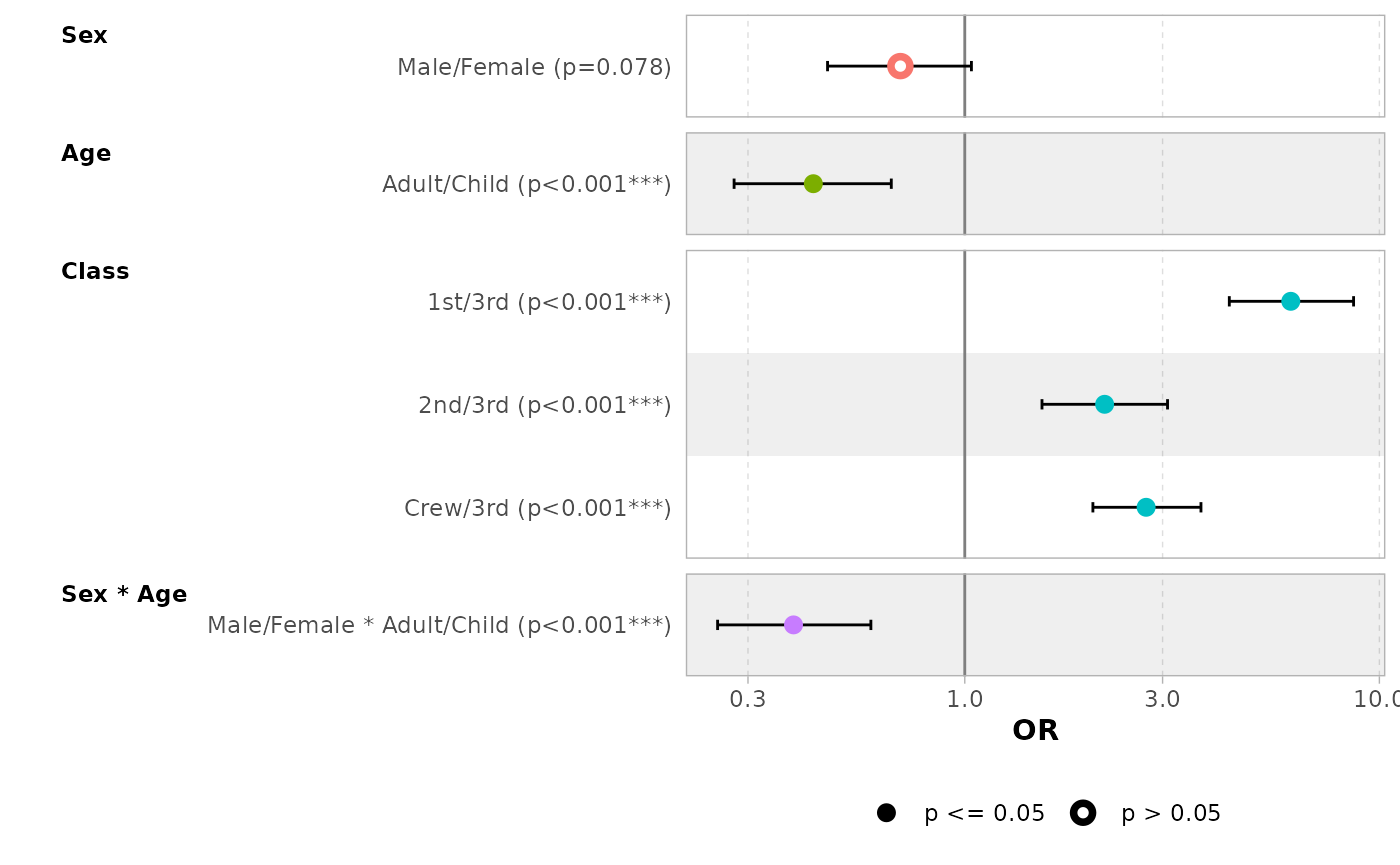 In the case of a logistic regression (or any other model for which coefficients are usually exponentiated), simply indicated exponentiate = TRUE. Note that a logarithmic scale will be used for the x-axis.