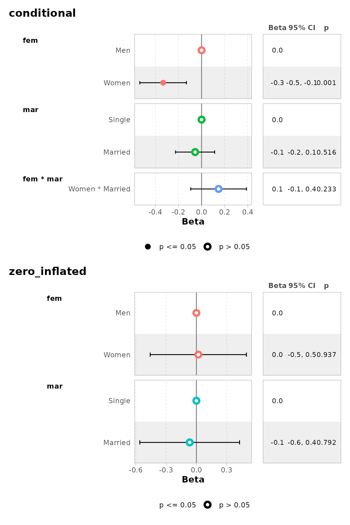 Multi-components models such as zero-inflated Poisson or beta regression generate a set of terms for each of their components. simply use ggcoef_model() or ggcoef_table(). Additional visualizations are available using ggcoef_dodged() or ggcoef_faceted().