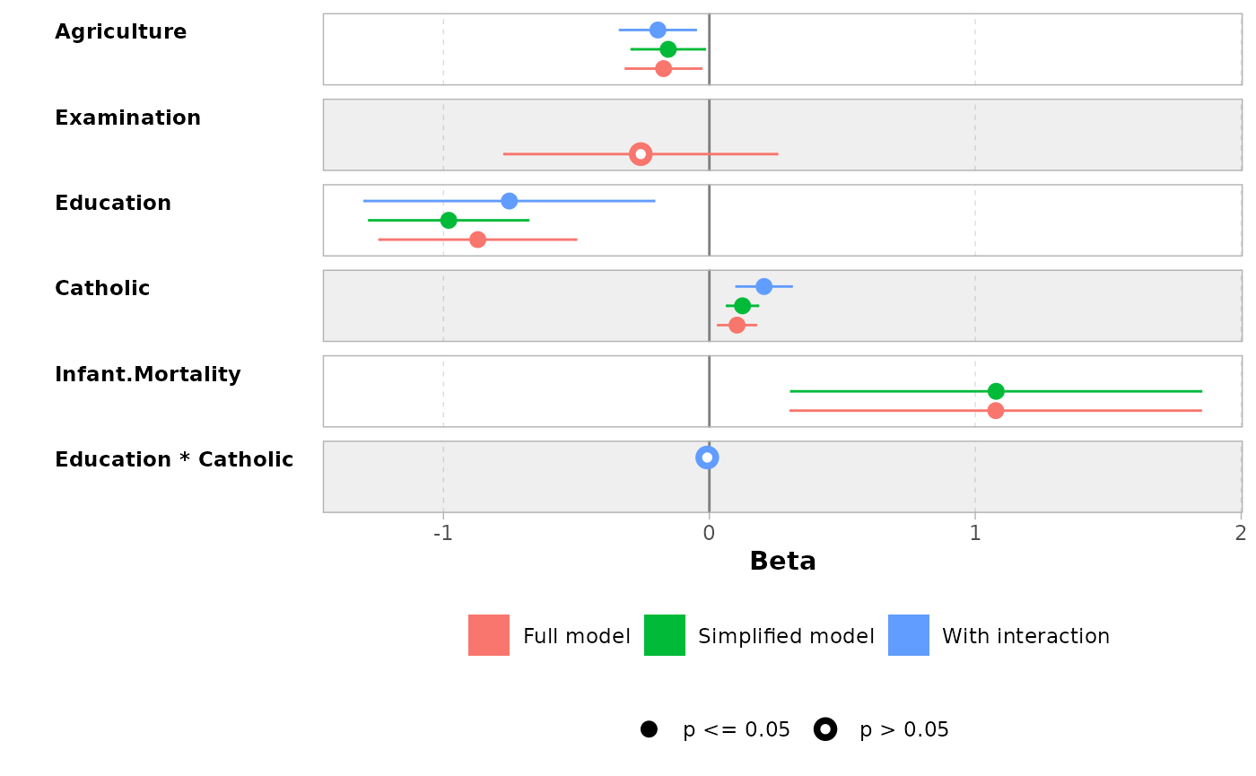 You can easily compare several models with ggcoef_compare(). To be noted, ggcoef_compare() is not compatible with multinomial or multi-components models.