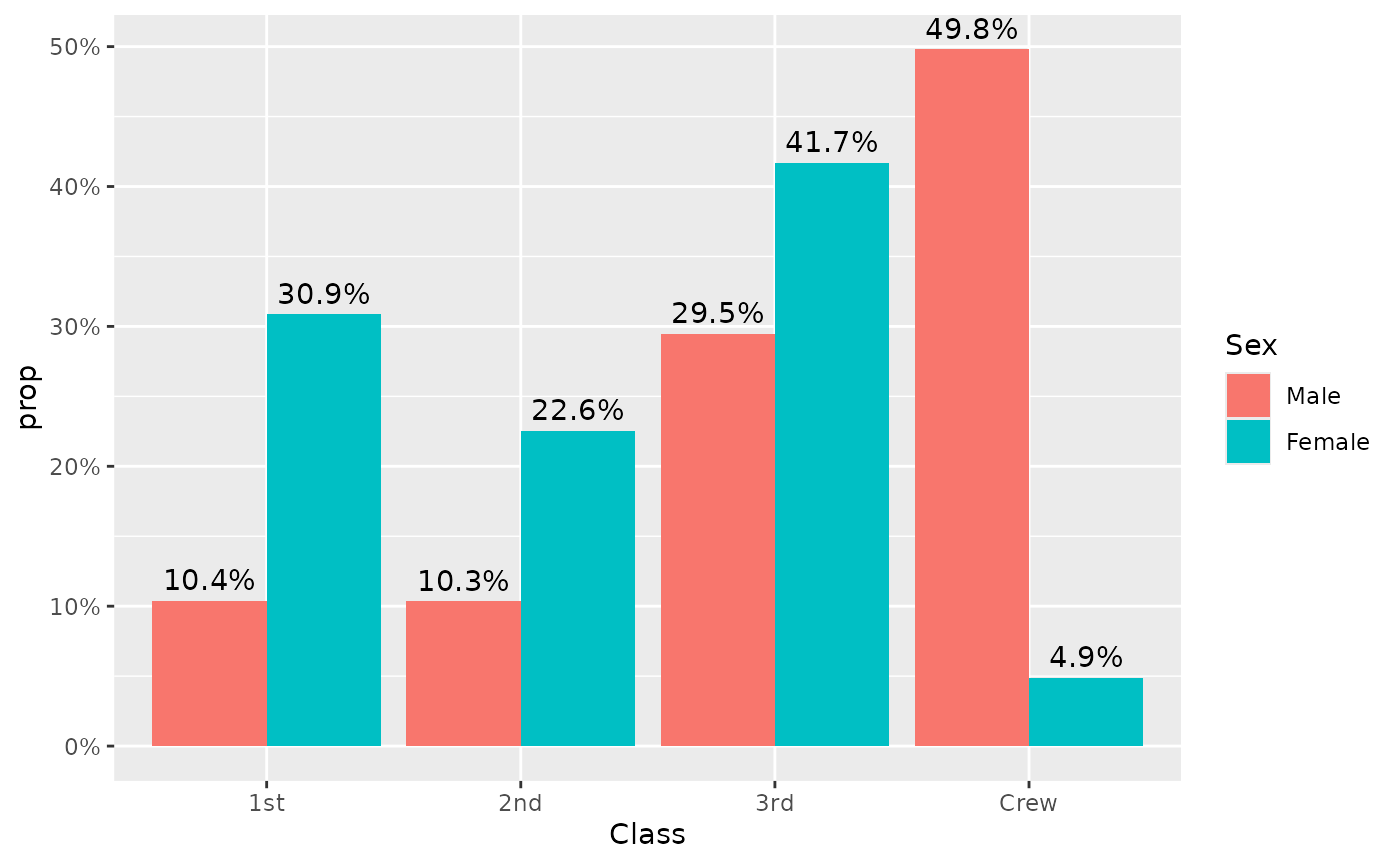 On the previous graph, it is difficult to see if first class is over- or under-represented among women, due to the fact they were much more men on the boat. stat_prop() could be used to adjust the graph by displaying instead the proportion within each category (i.e. here the proportion by sex).