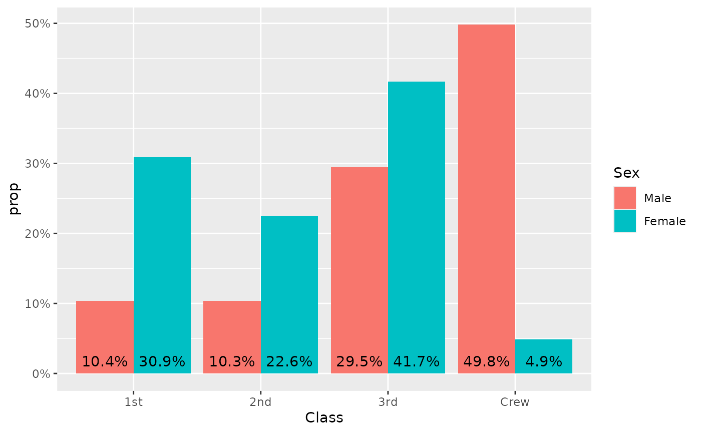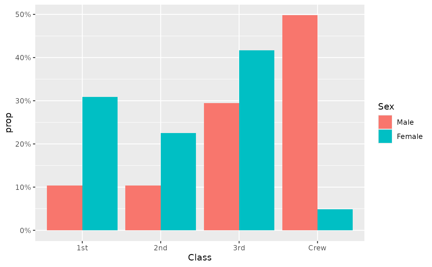 aes(x = Class, fill = Sex, weight = Freq, by = Sex, y = after_stat(prop)) +