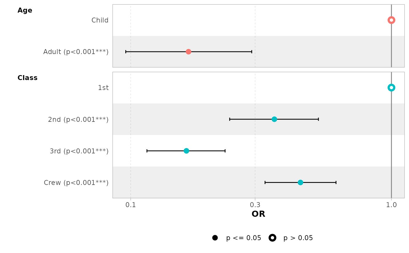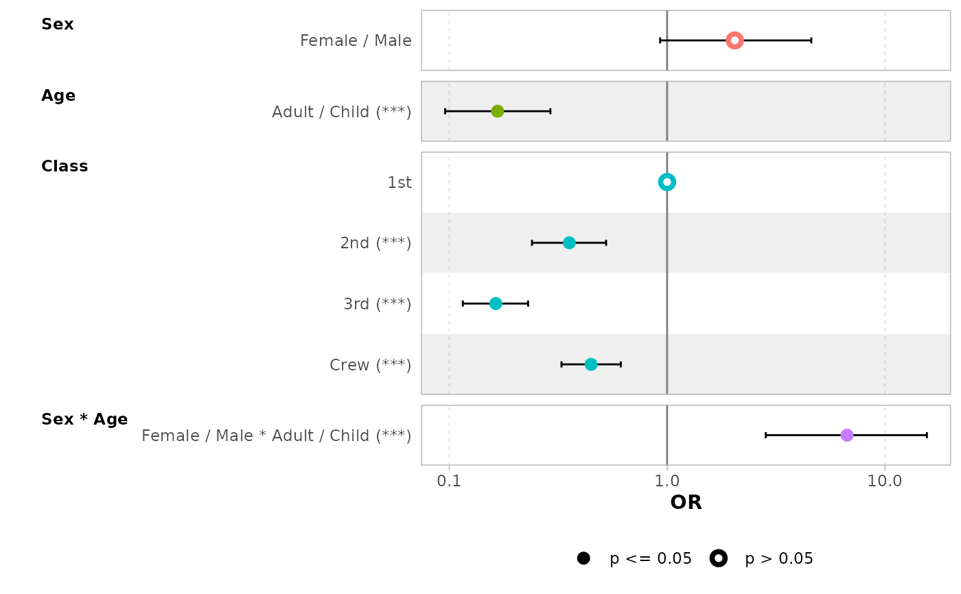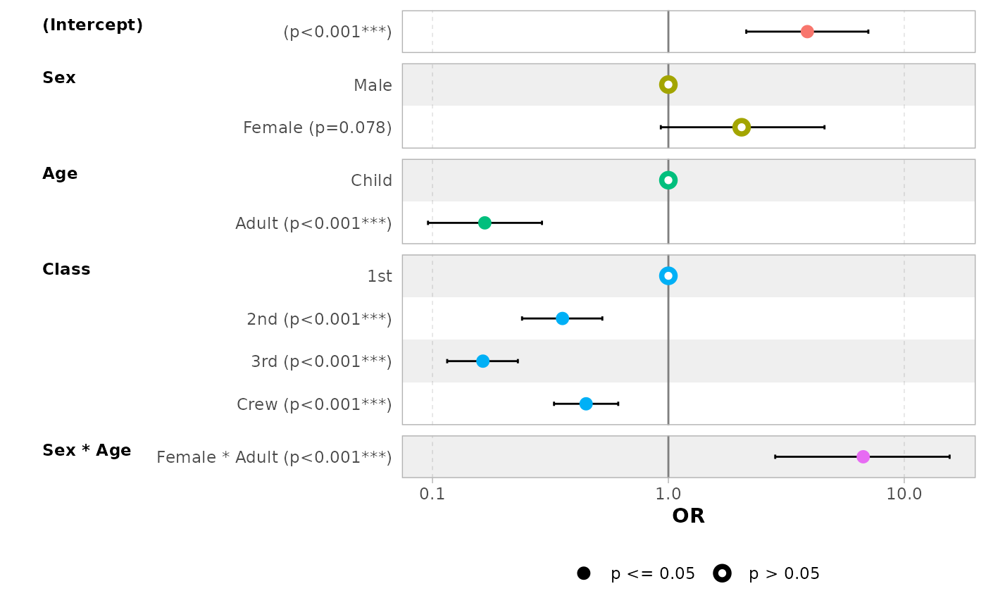 ggcoef_model(mod_titanic, exponentiate = TRUE, significance = NULL)