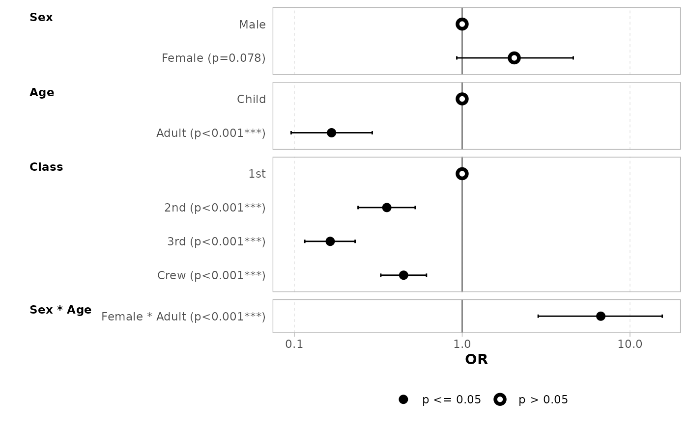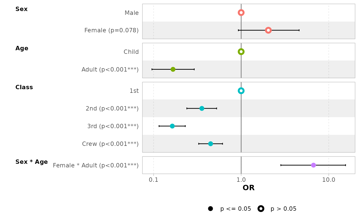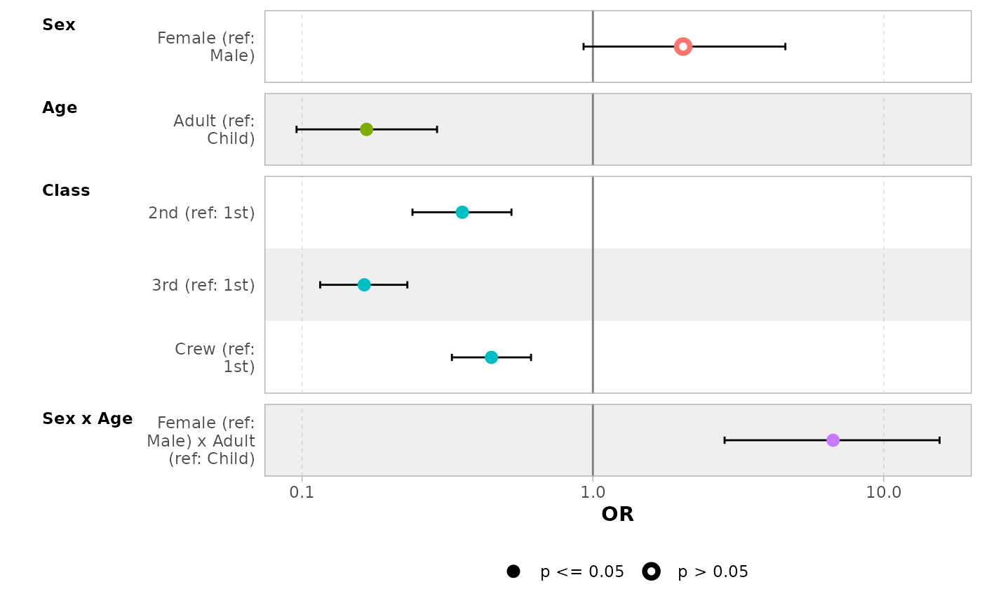 ggcoef_model(mod_titanic, exponentiate = TRUE, significance = NULL)