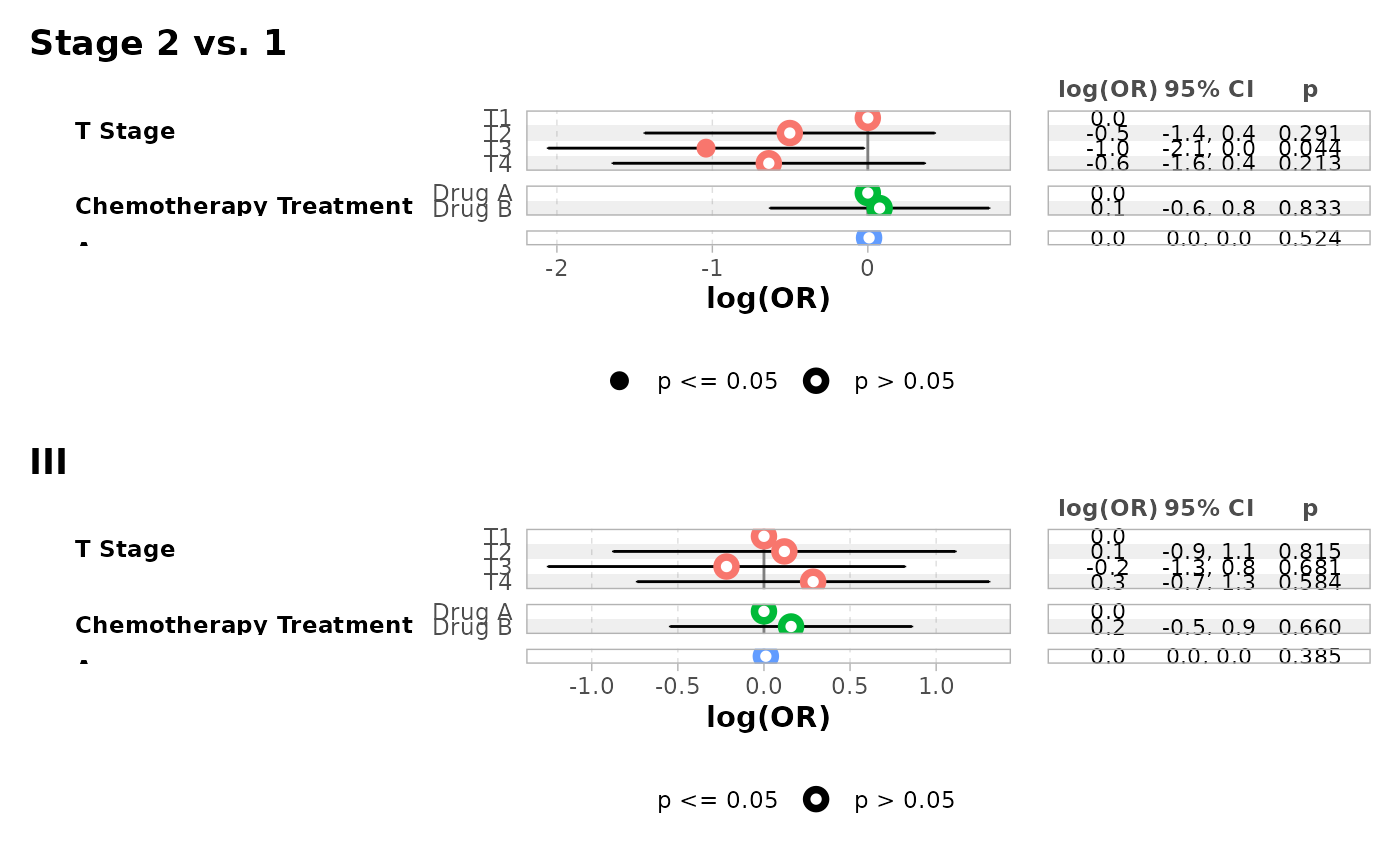 ggcoef_table(mod, group_labels = c(II = "Stage 2 vs. 1"))