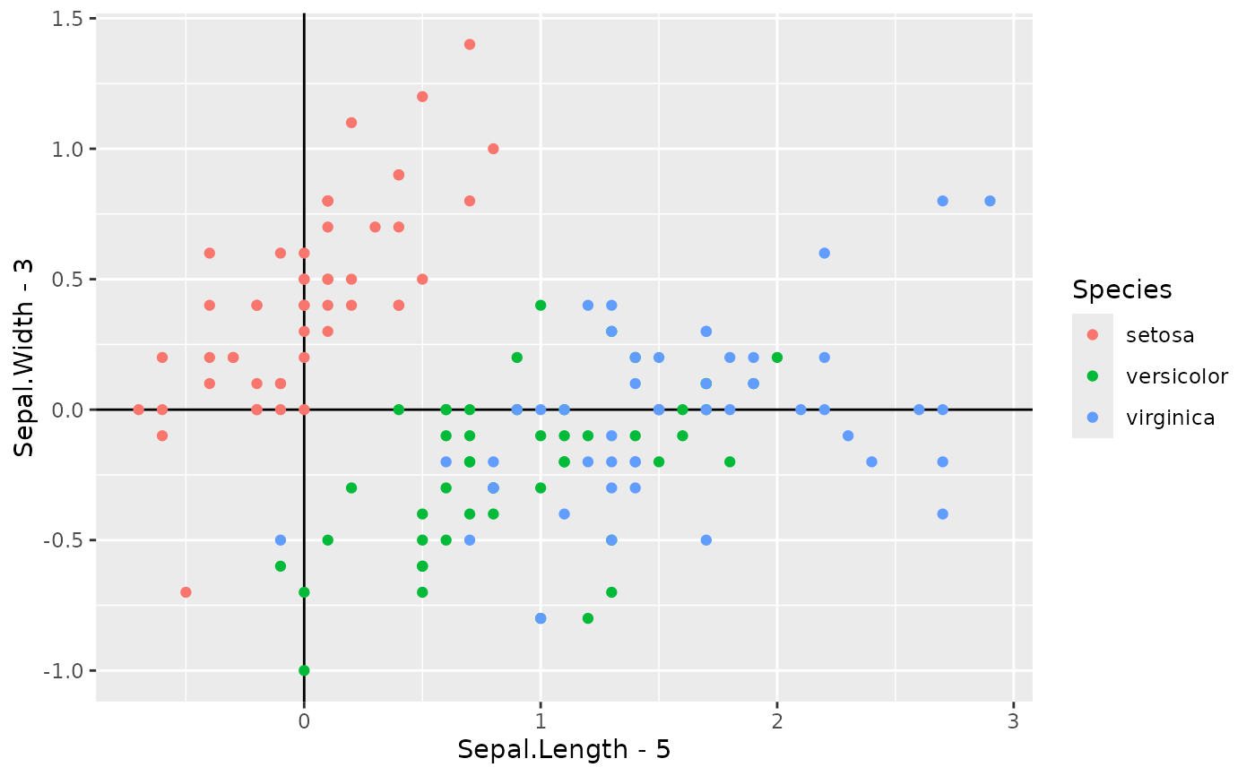 aes(x = Sepal.Length - 5, y = Sepal.Width - 3, colour = Species) +