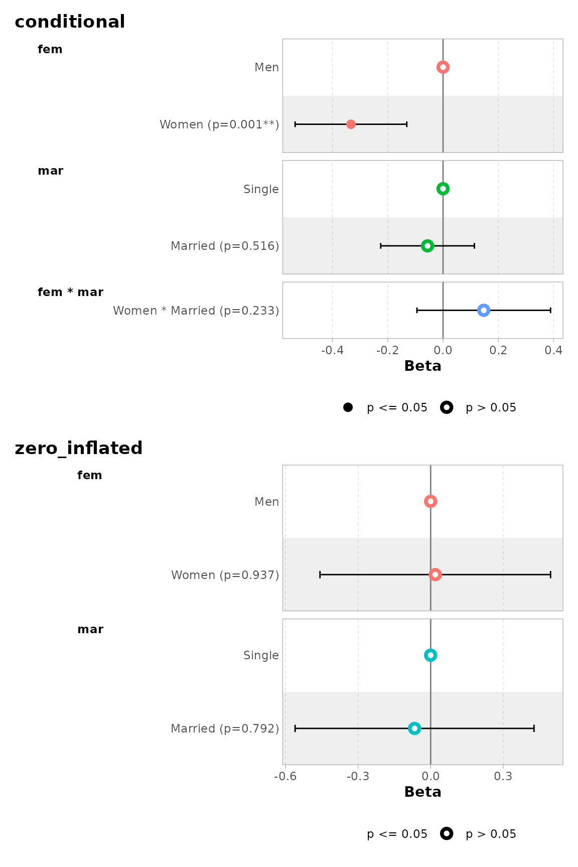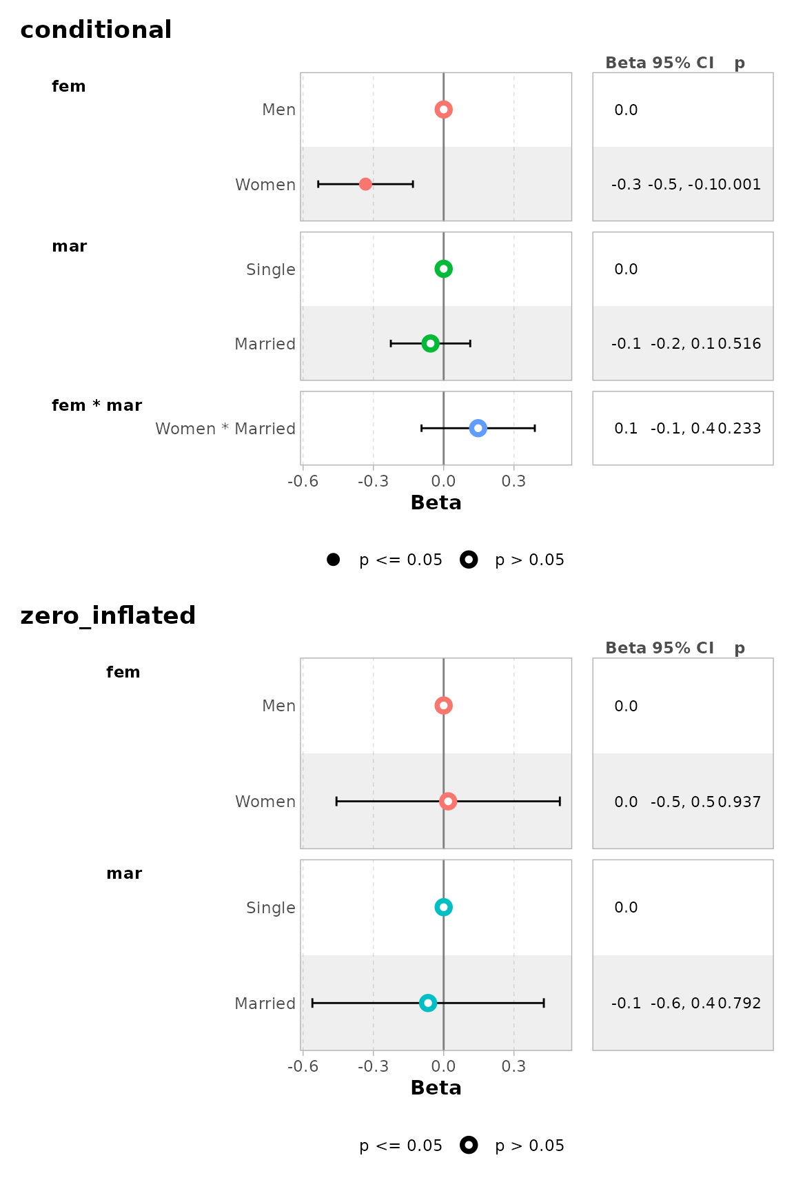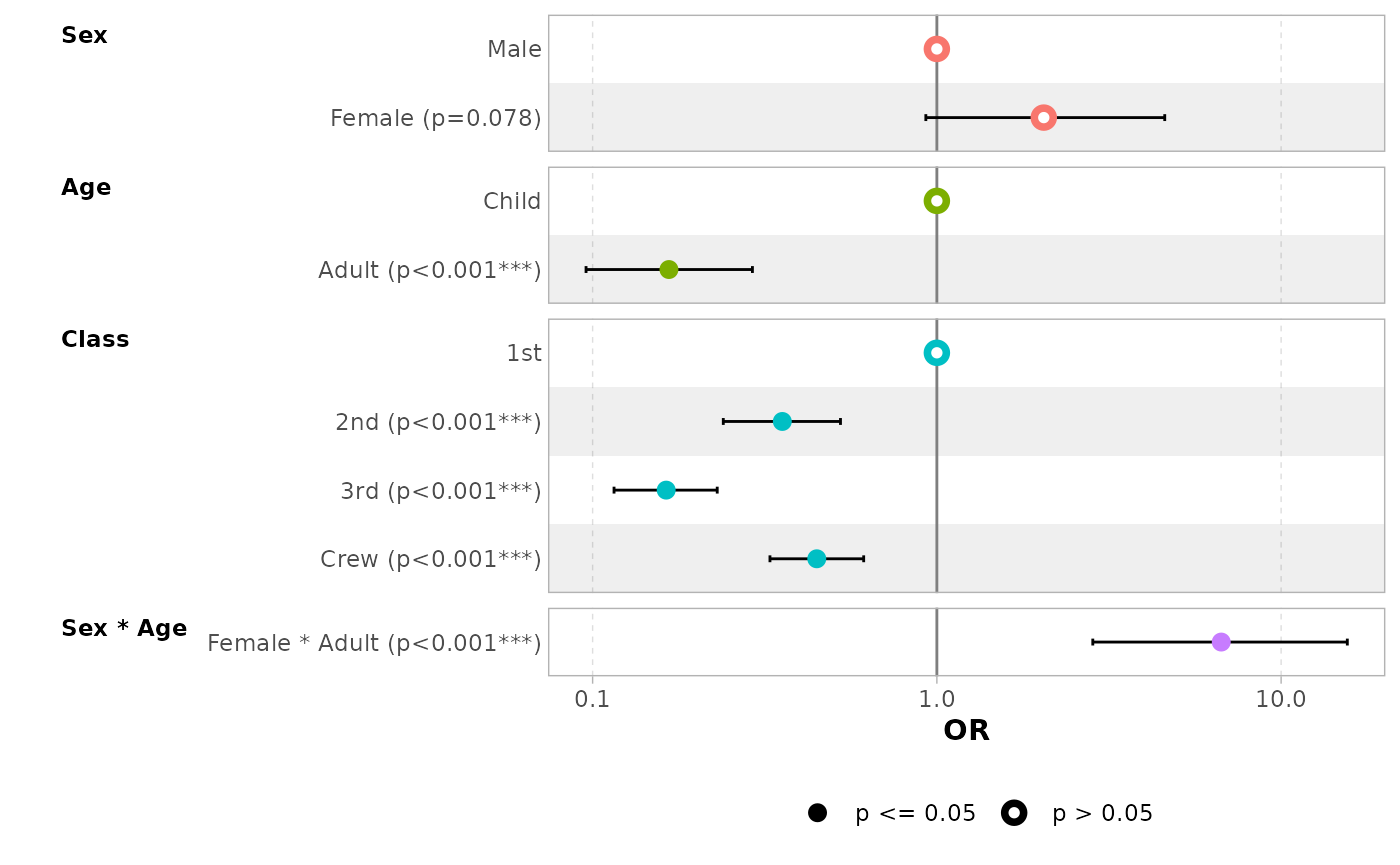 By default, for categorical variables using treatment and sum contrasts, reference rows will be added and displayed on the graph.