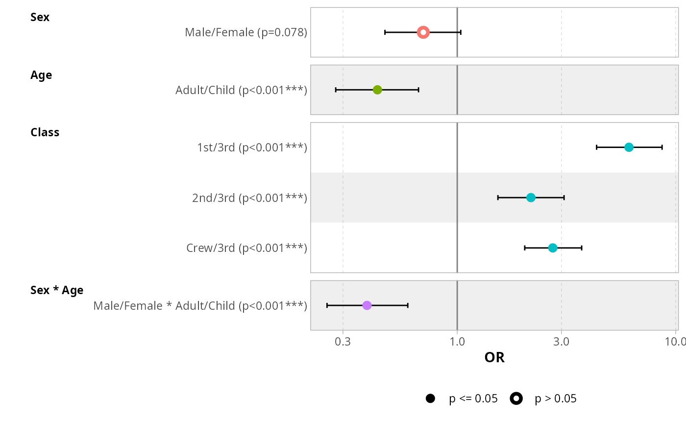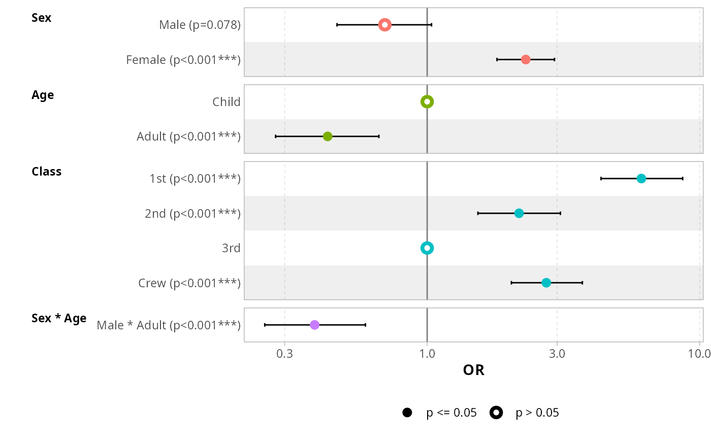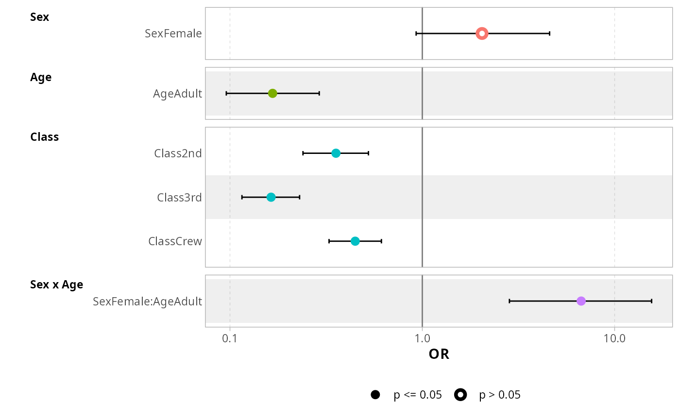 ggcoef_model(mod_titanic2, exponentiate = TRUE)
