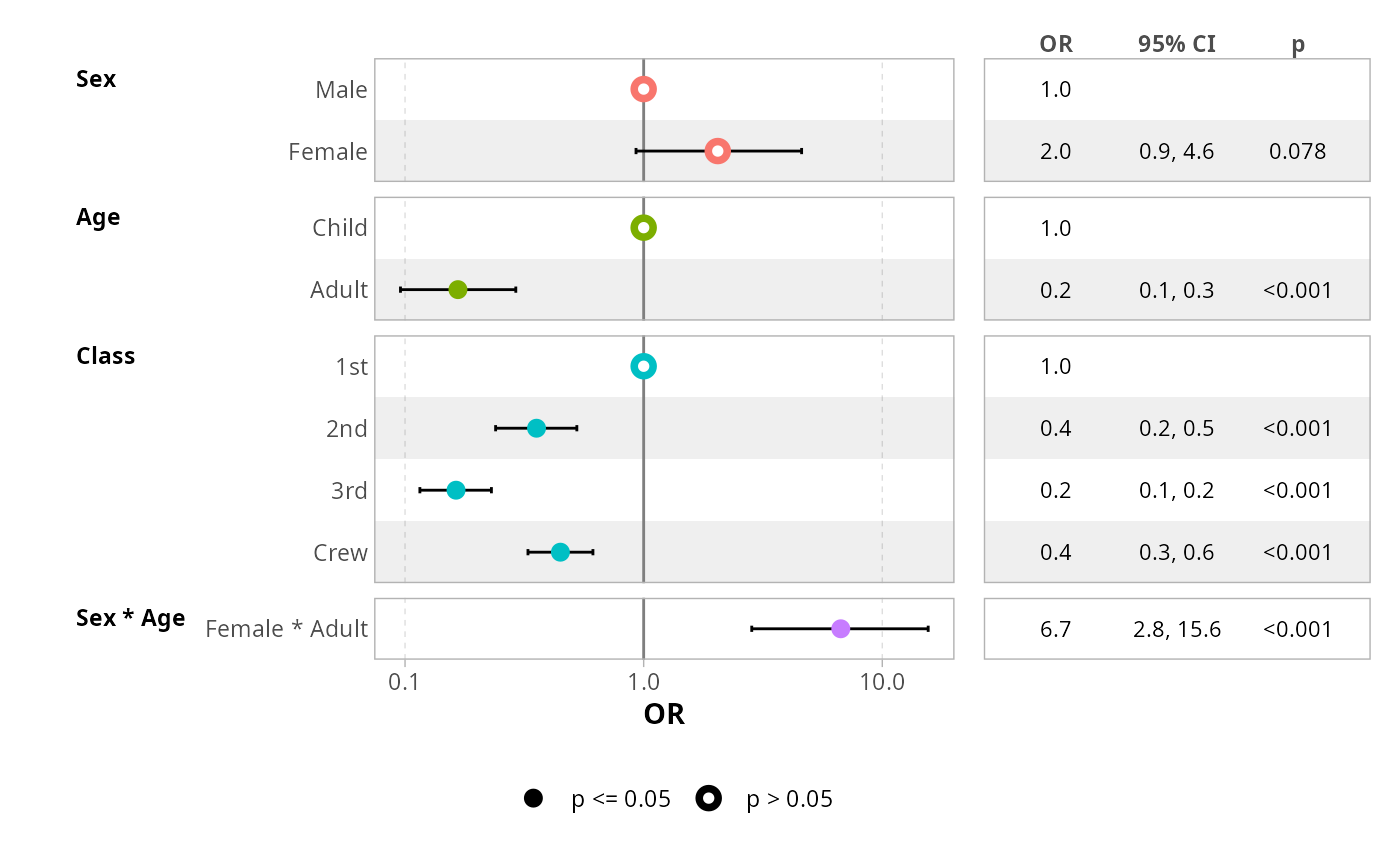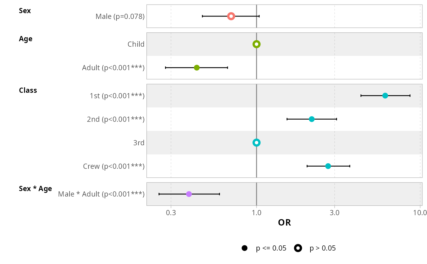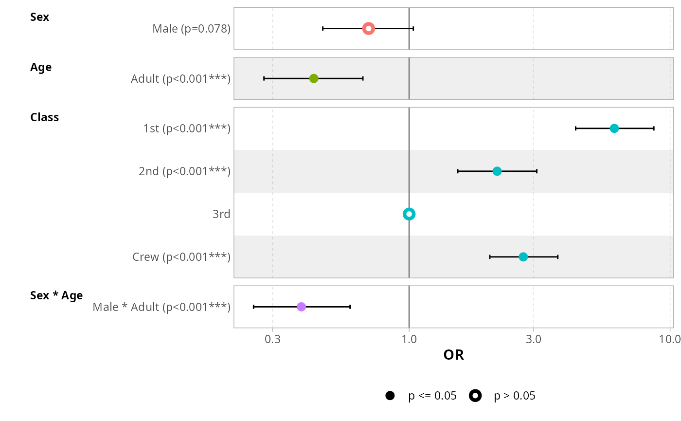 ggcoef_model(mod_titanic2, exponentiate = TRUE)