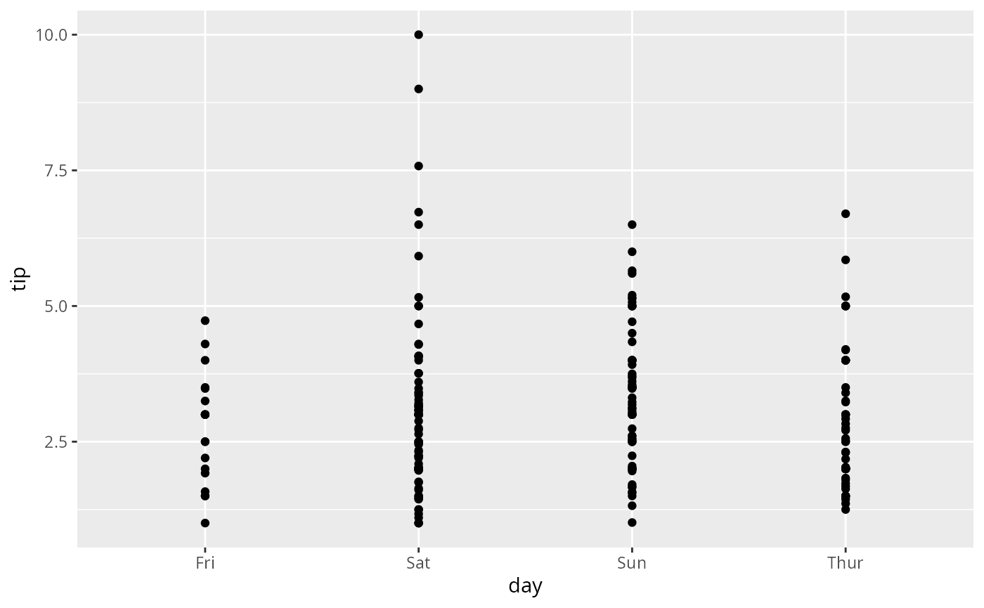 Let’s take an example. The following plot shows all tips received according to the day of the week.