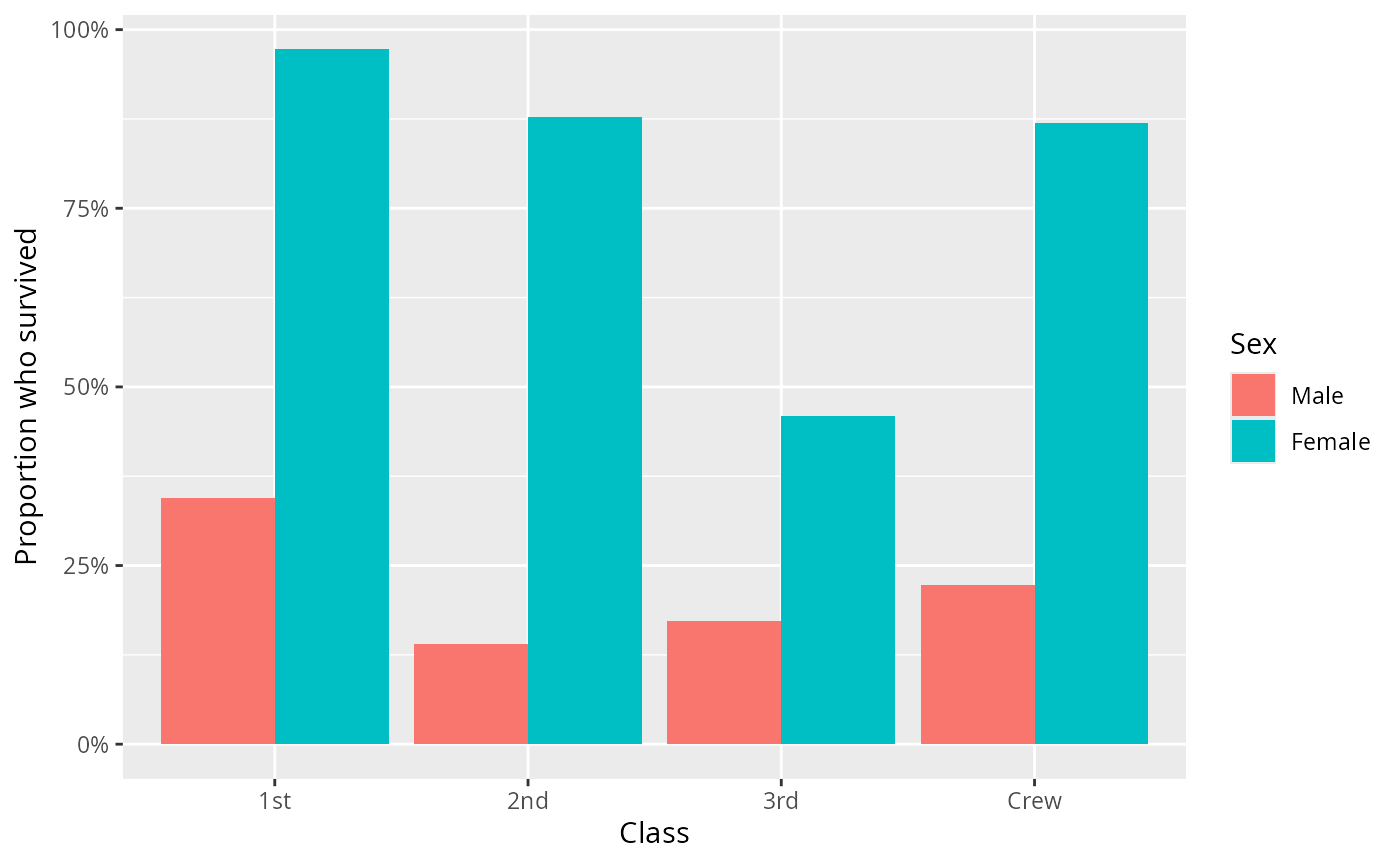 aes(x = Class, y = as.integer(Survived == "Yes"), weight = Freq, fill = Sex) +