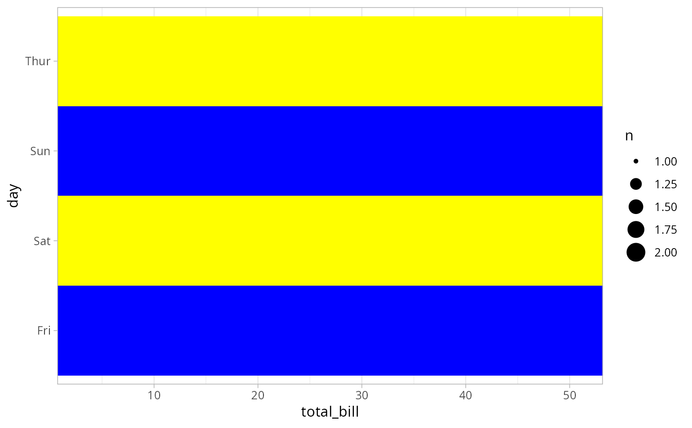 layer()'sparamsargument. These arguments broadly fall into one of 4 categories below. Notably, further arguments to thepositionargument, or aesthetics that are required can not be passed through.... Unknown arguments that are not part of the 4 categories below are ignored.Static aesthetics that are not mapped to a scale, but are at a fixed value and apply to the layer as a whole. For example,