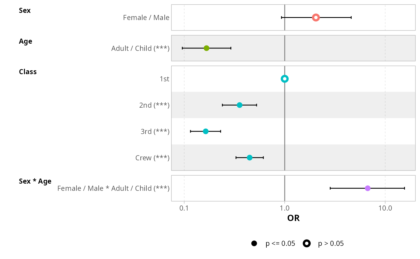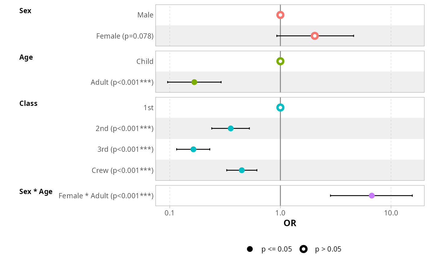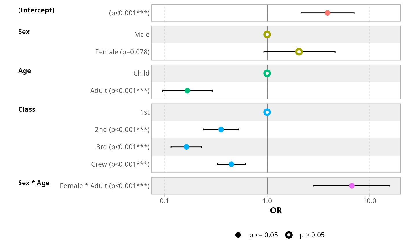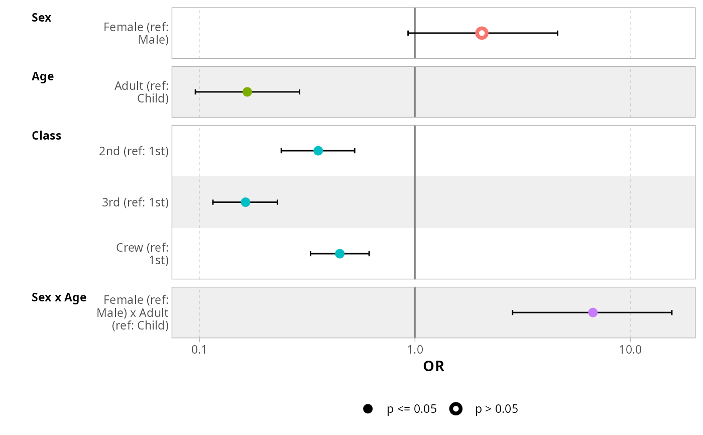 ggcoef_model(mod_titanic, exponentiate = TRUE, significance = NULL)
