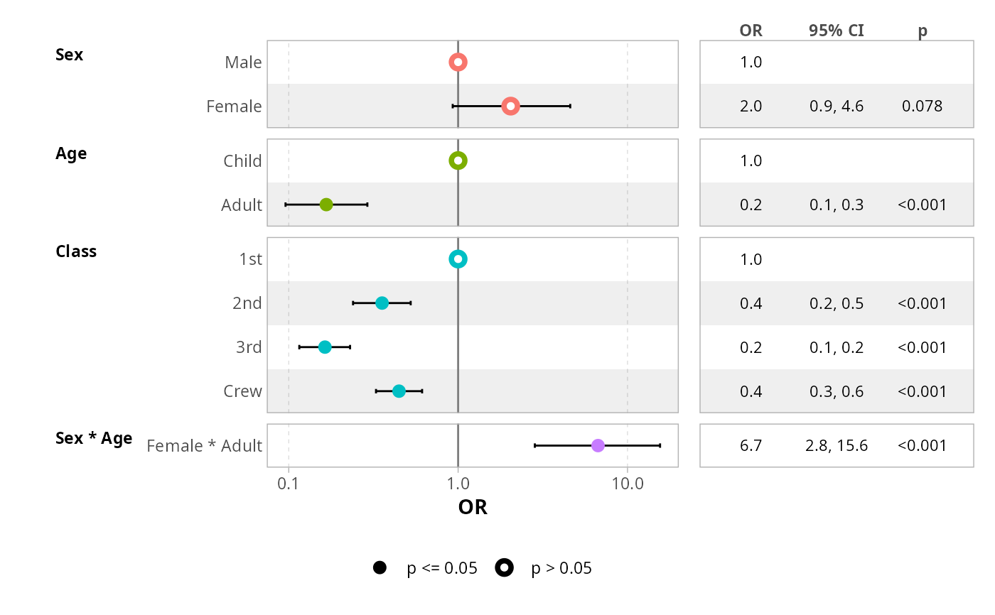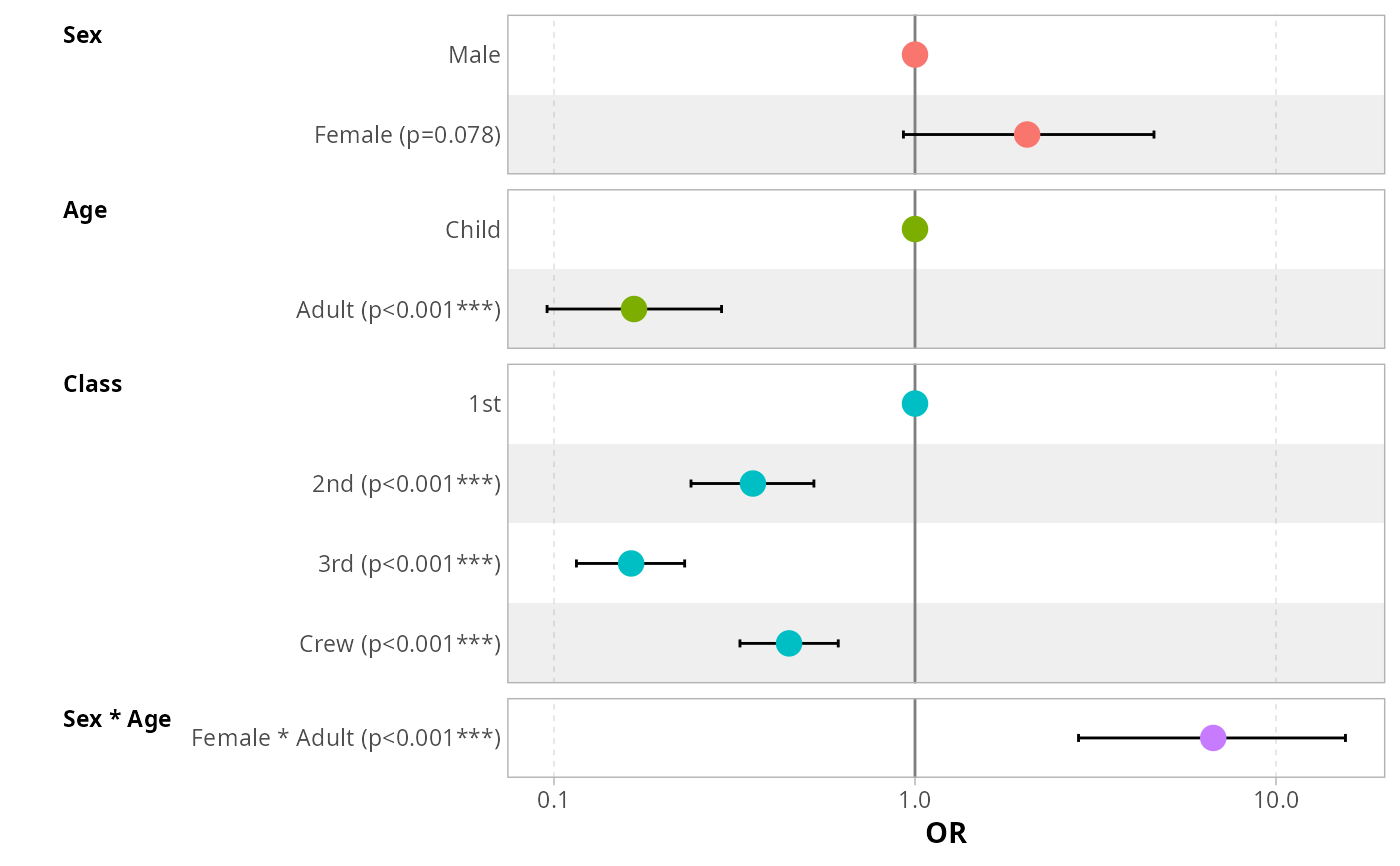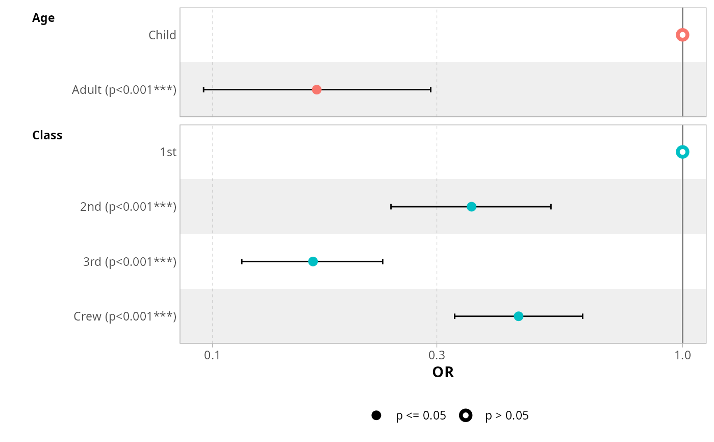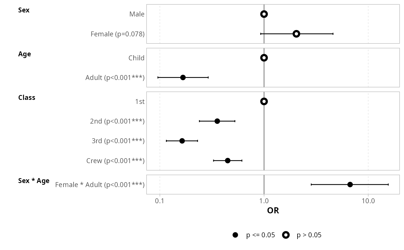 ggcoef_model(mod_titanic, exponentiate = TRUE, significance = NULL)