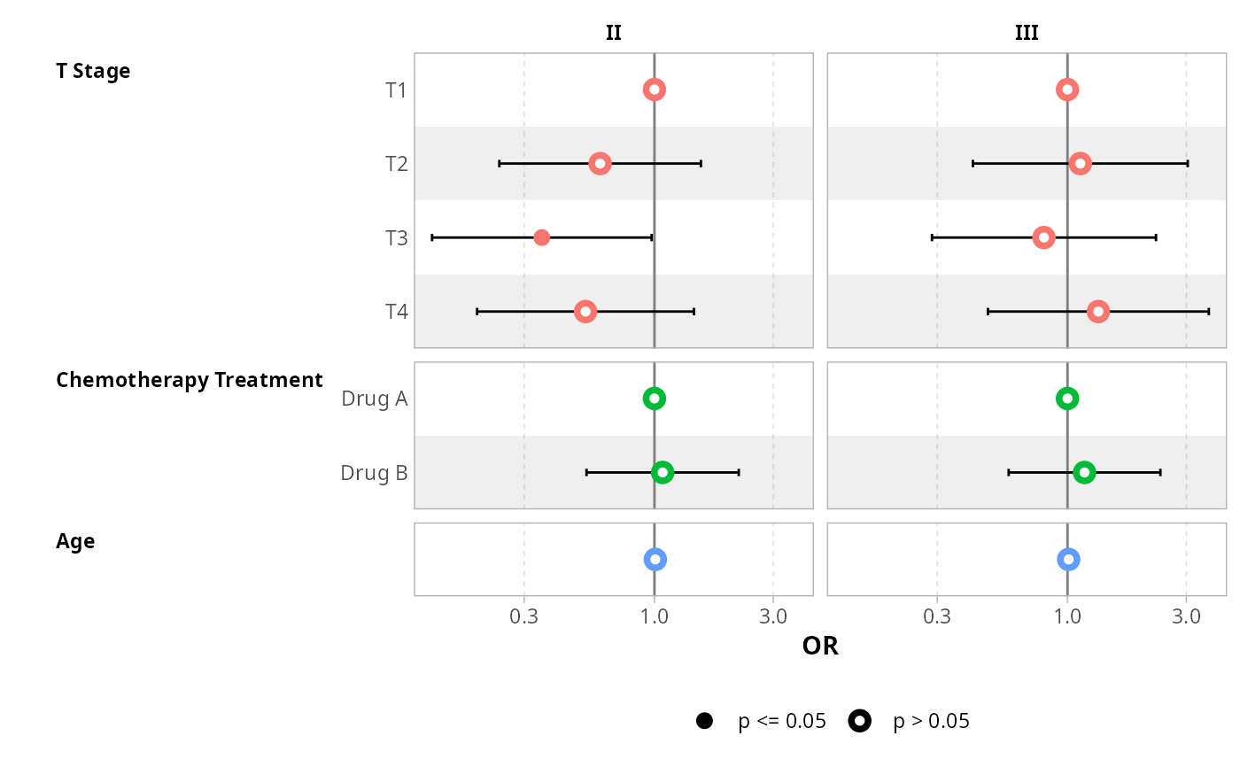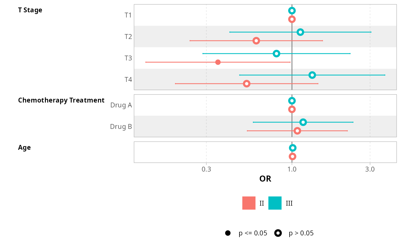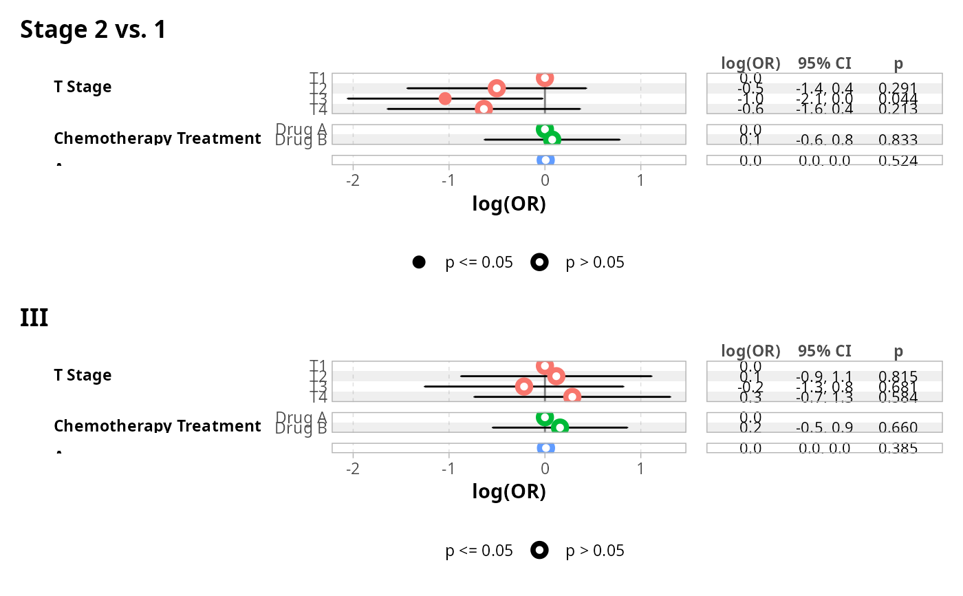 ggcoef_table(mod, group_labels = c(II = "Stage 2 vs. 1"))