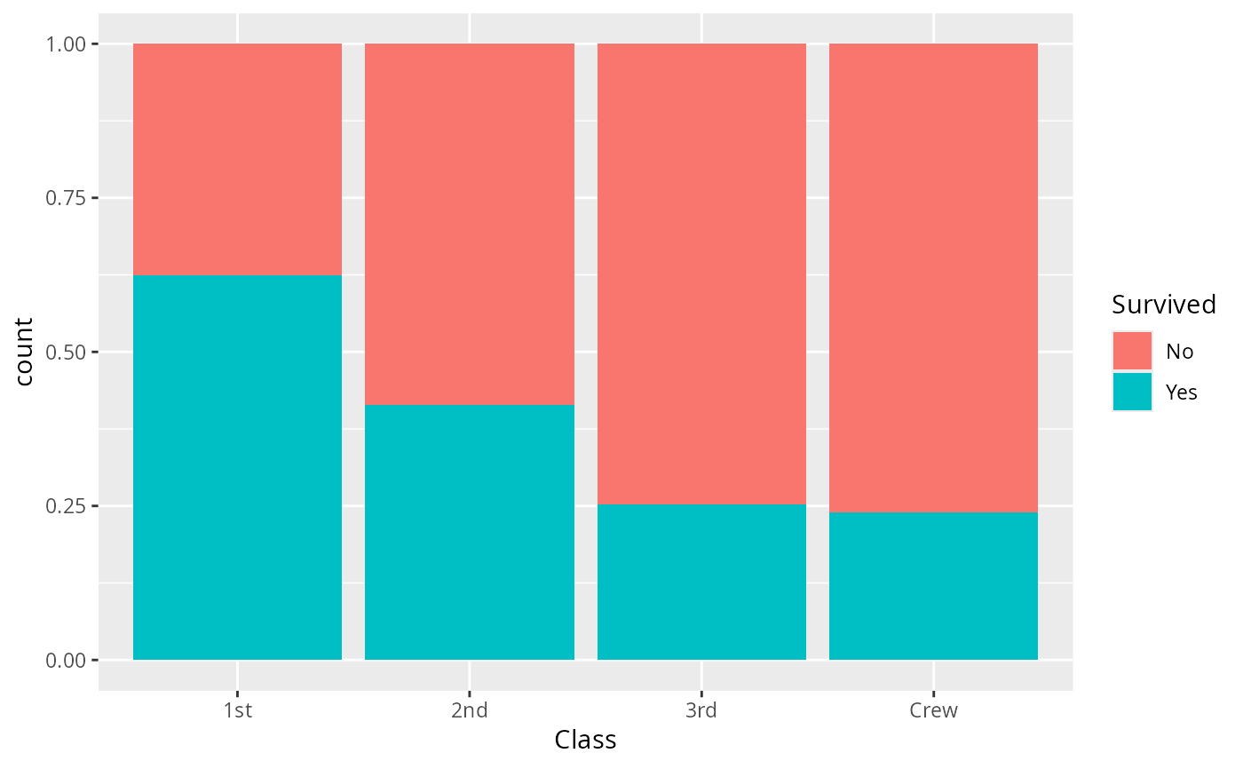 ggplot2::aes(x = Class, fill = Survived) +