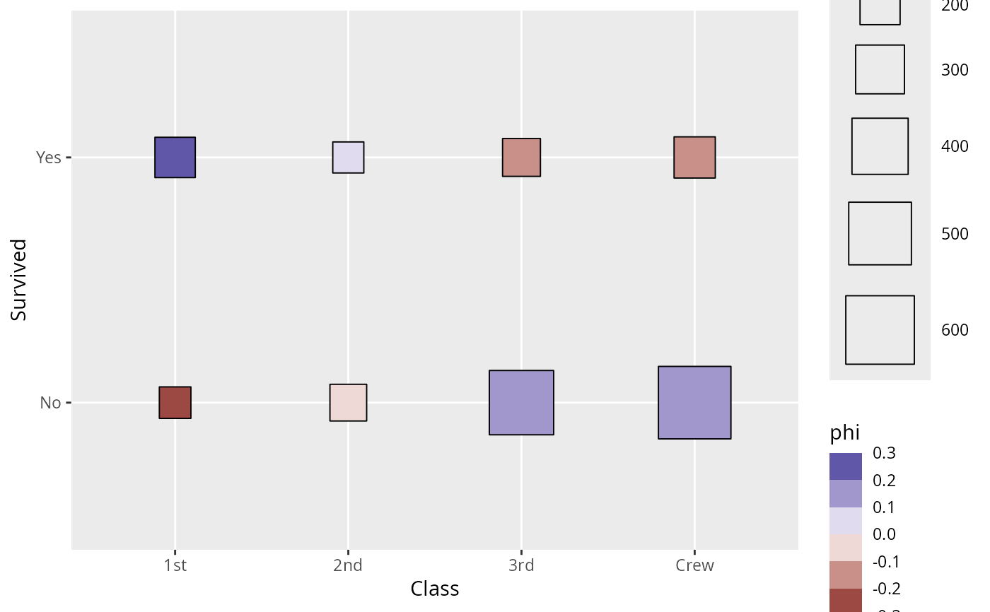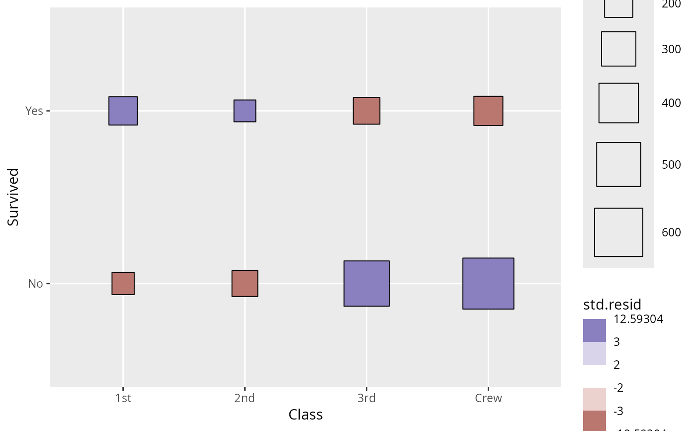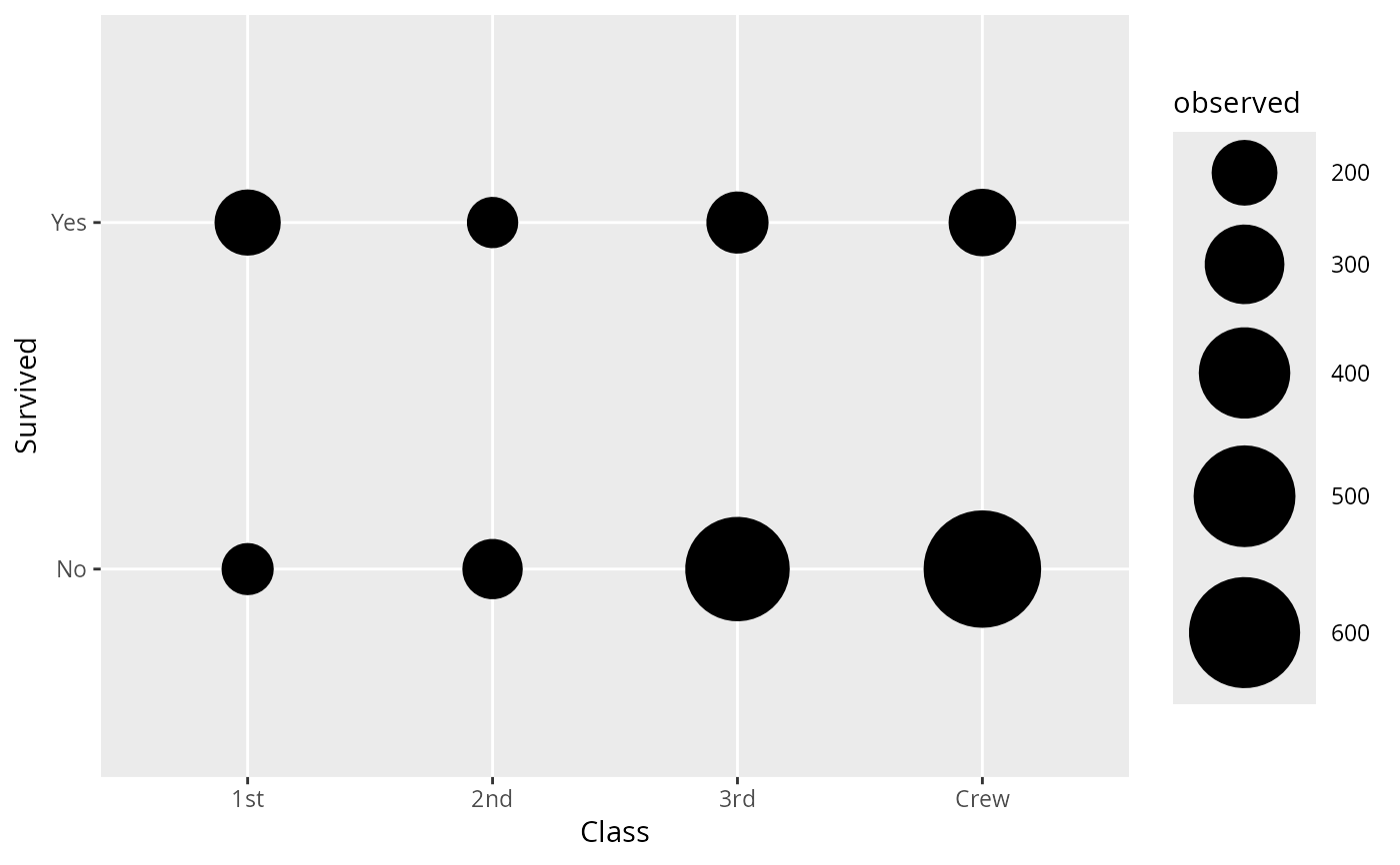 aes(x = Class, y = Survived, weight = Freq, size = after_stat(observed)) +