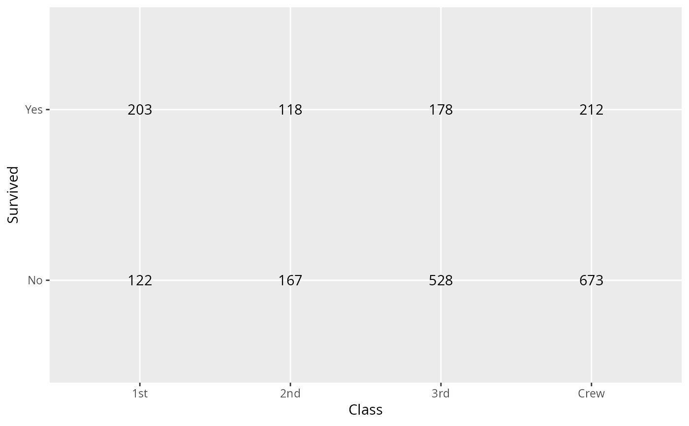 x = Class, y = Survived, weight = Freq, label = after_stat(observed)