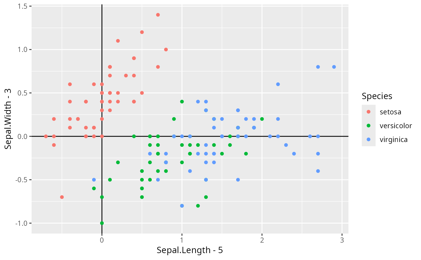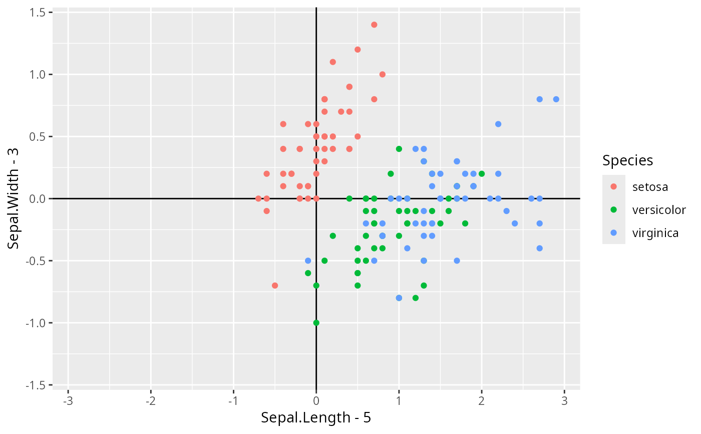 aes(x = Sepal.Length - 5, y = Sepal.Width - 3, colour = Species) +