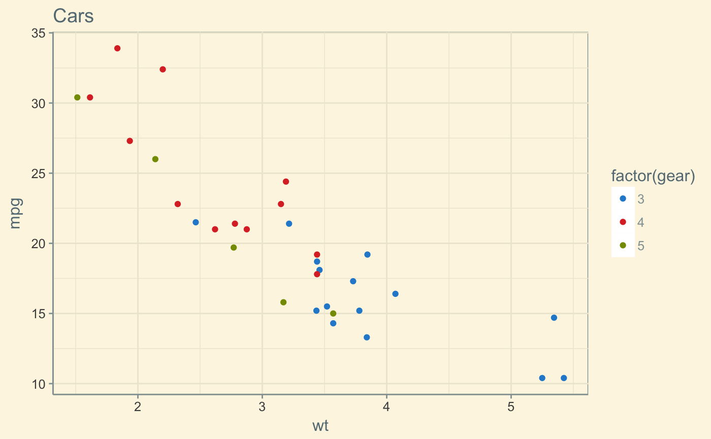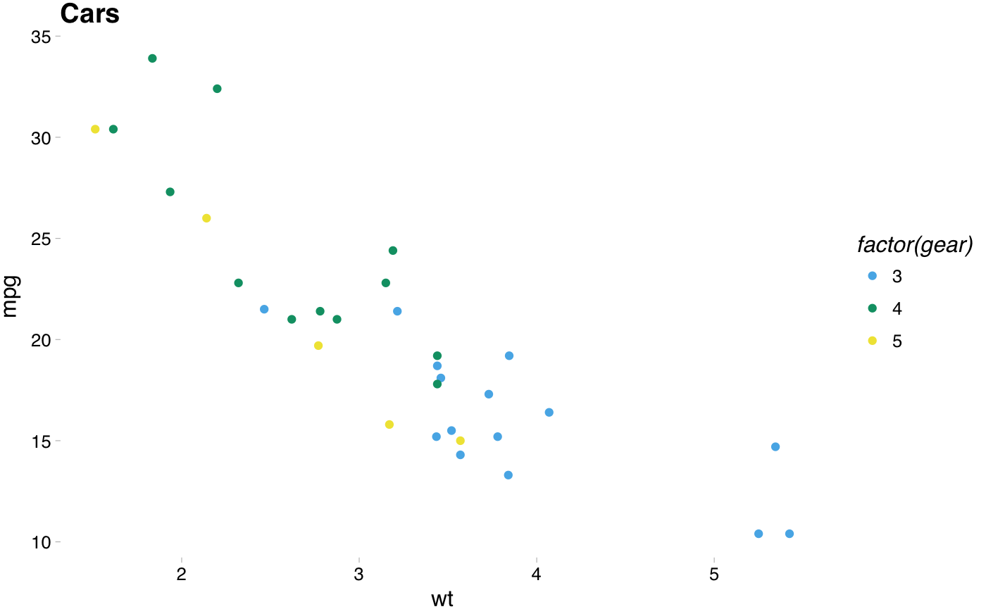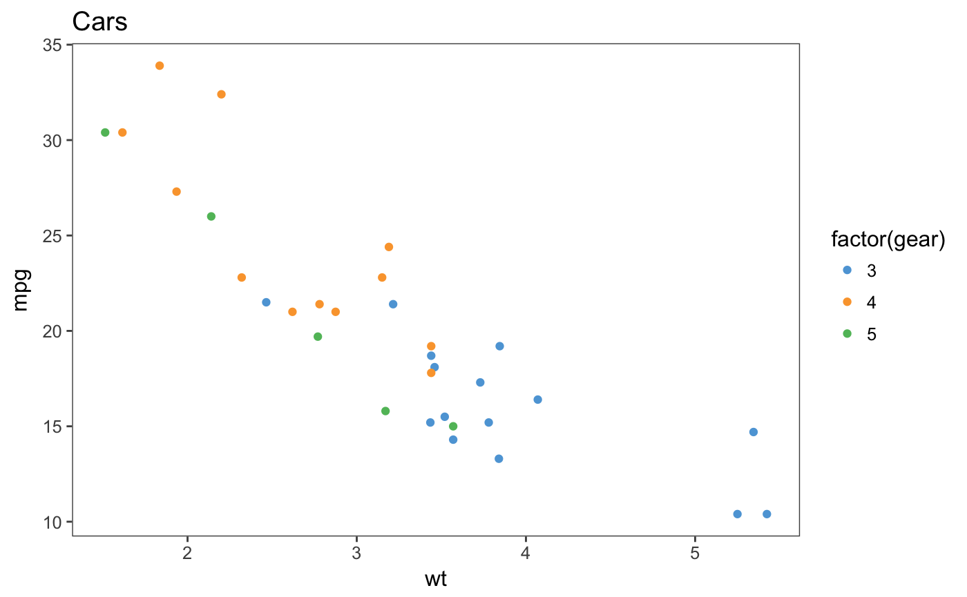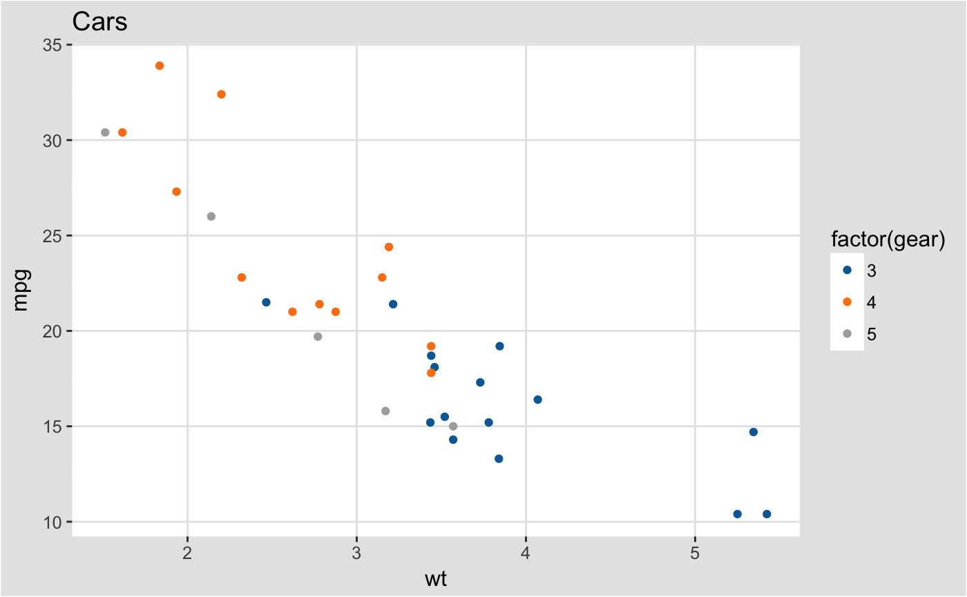 p2 <- ggplot(mtcars, aes(x = wt, y = mpg, colour = factor(gear))) +