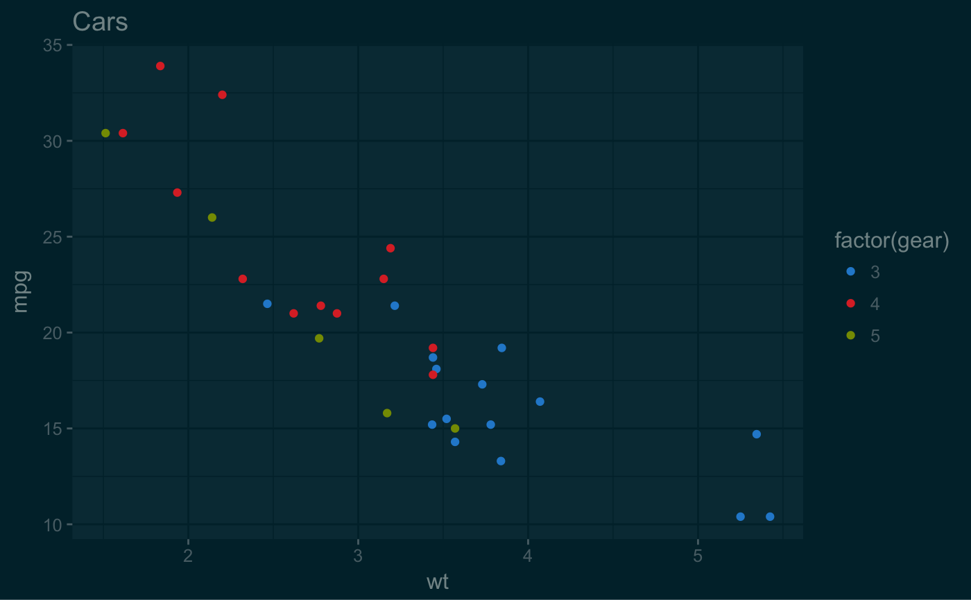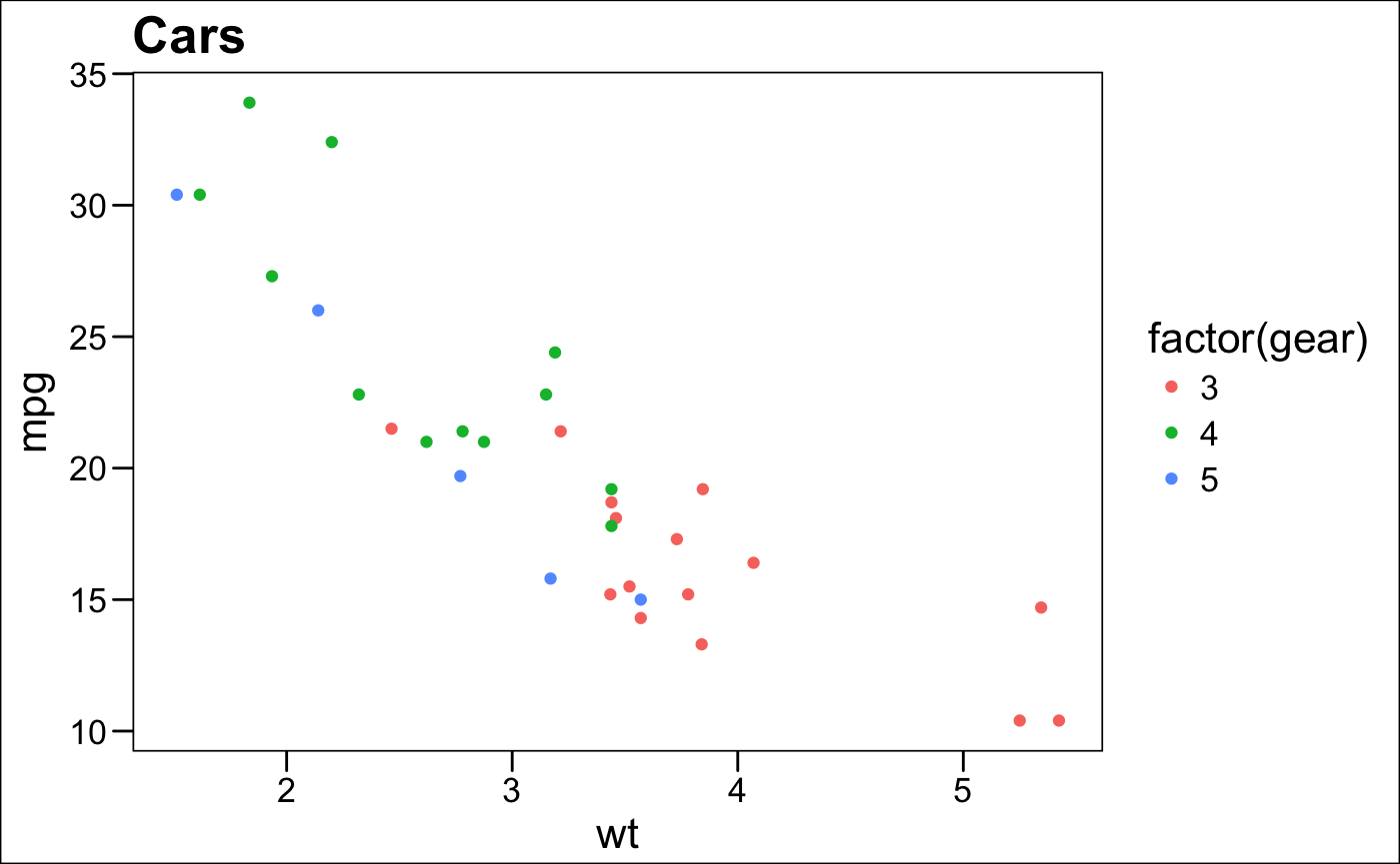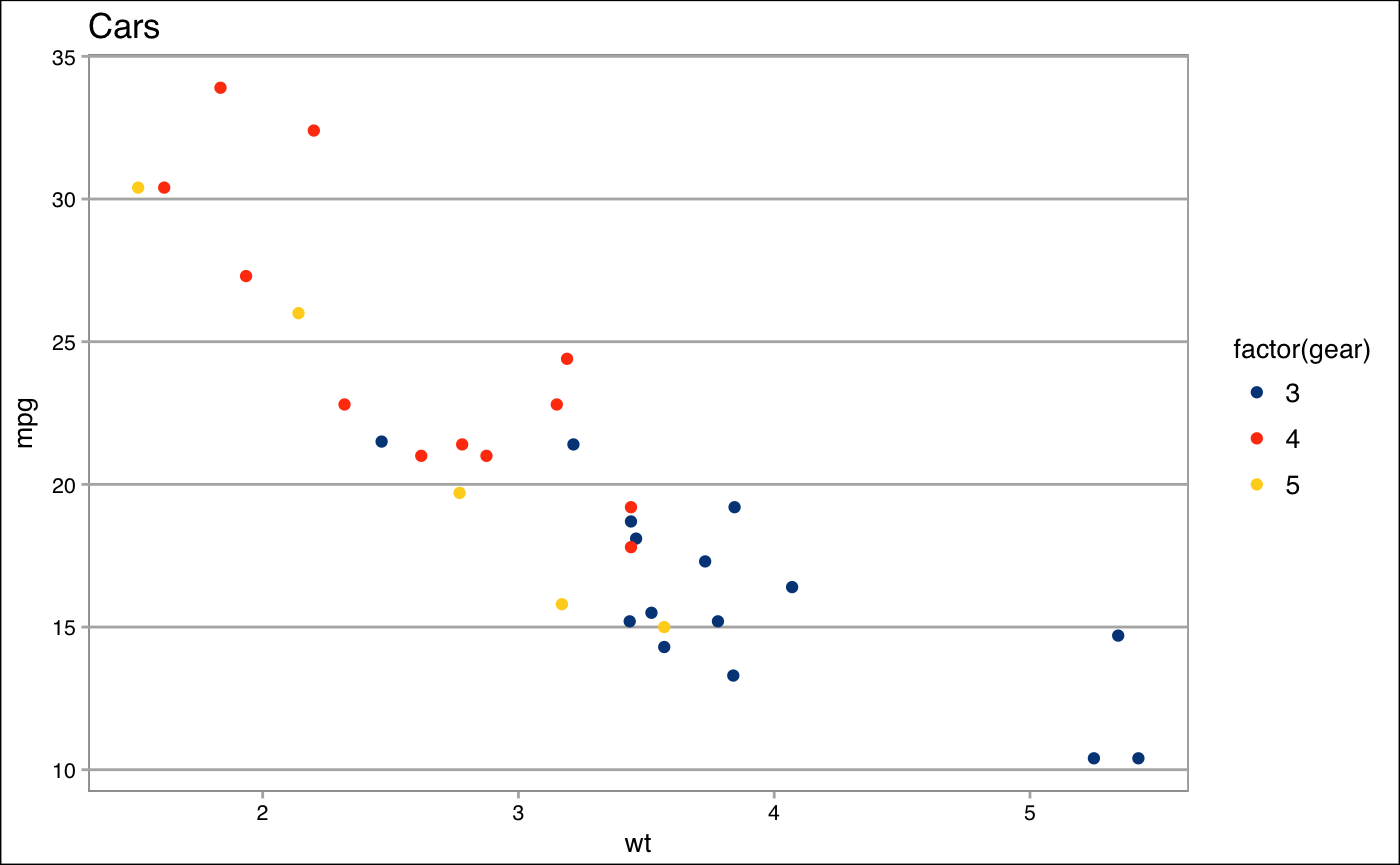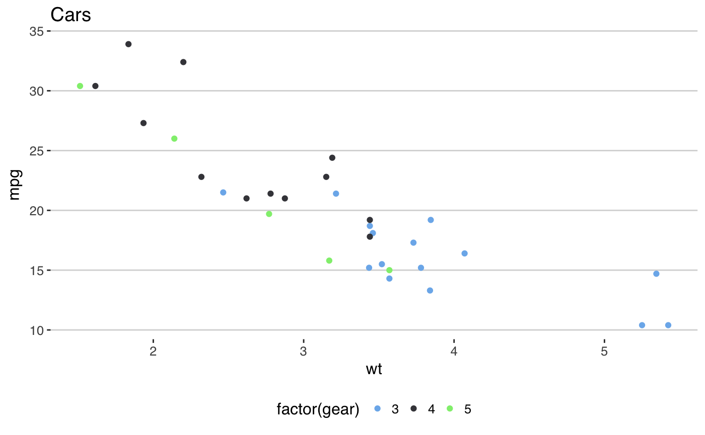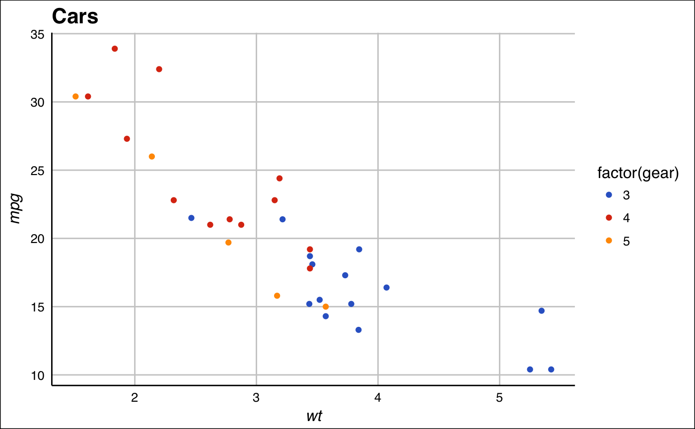 p2 <- ggplot(mtcars, aes(x = wt, y = mpg, colour = factor(gear))) +