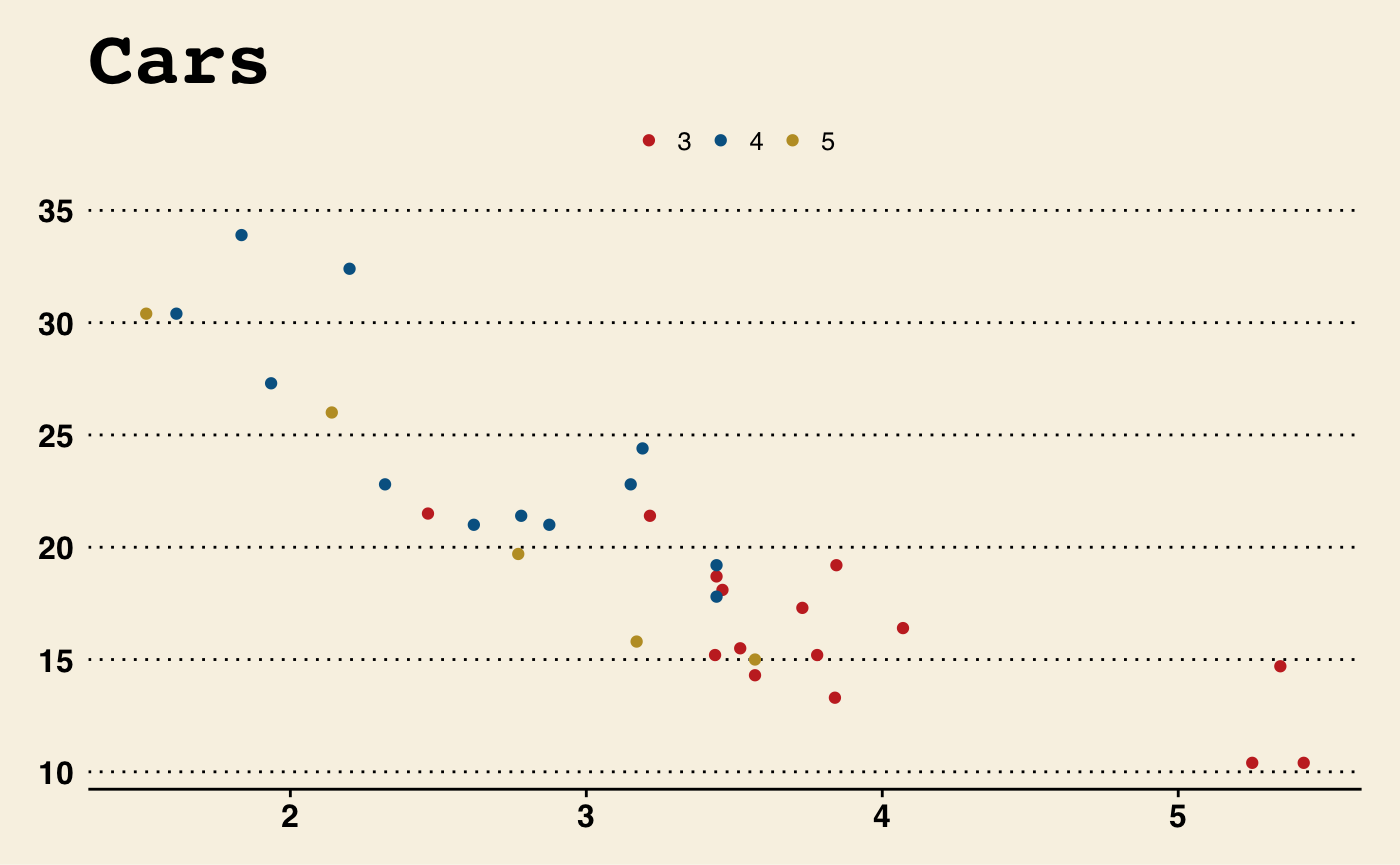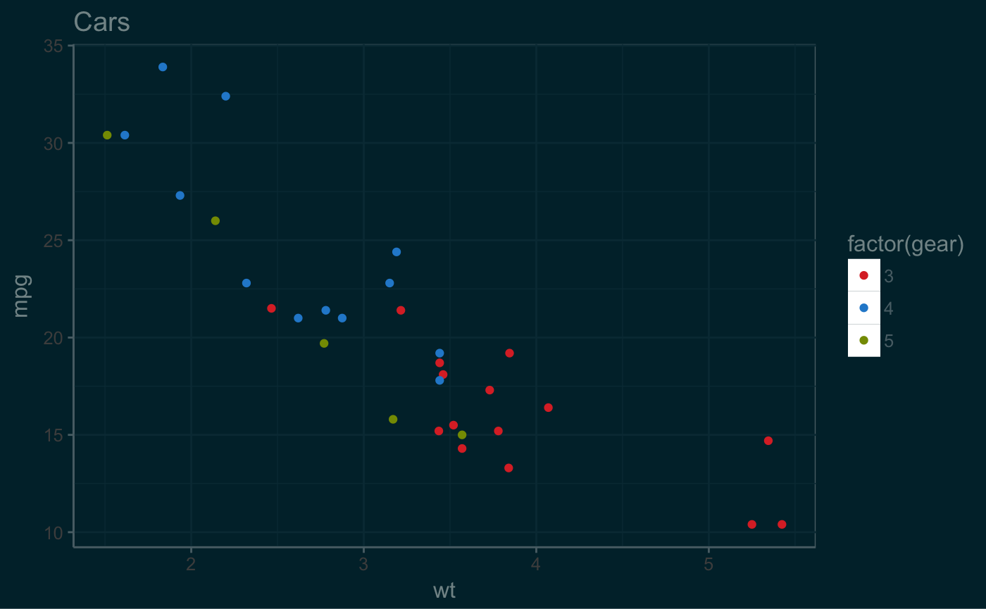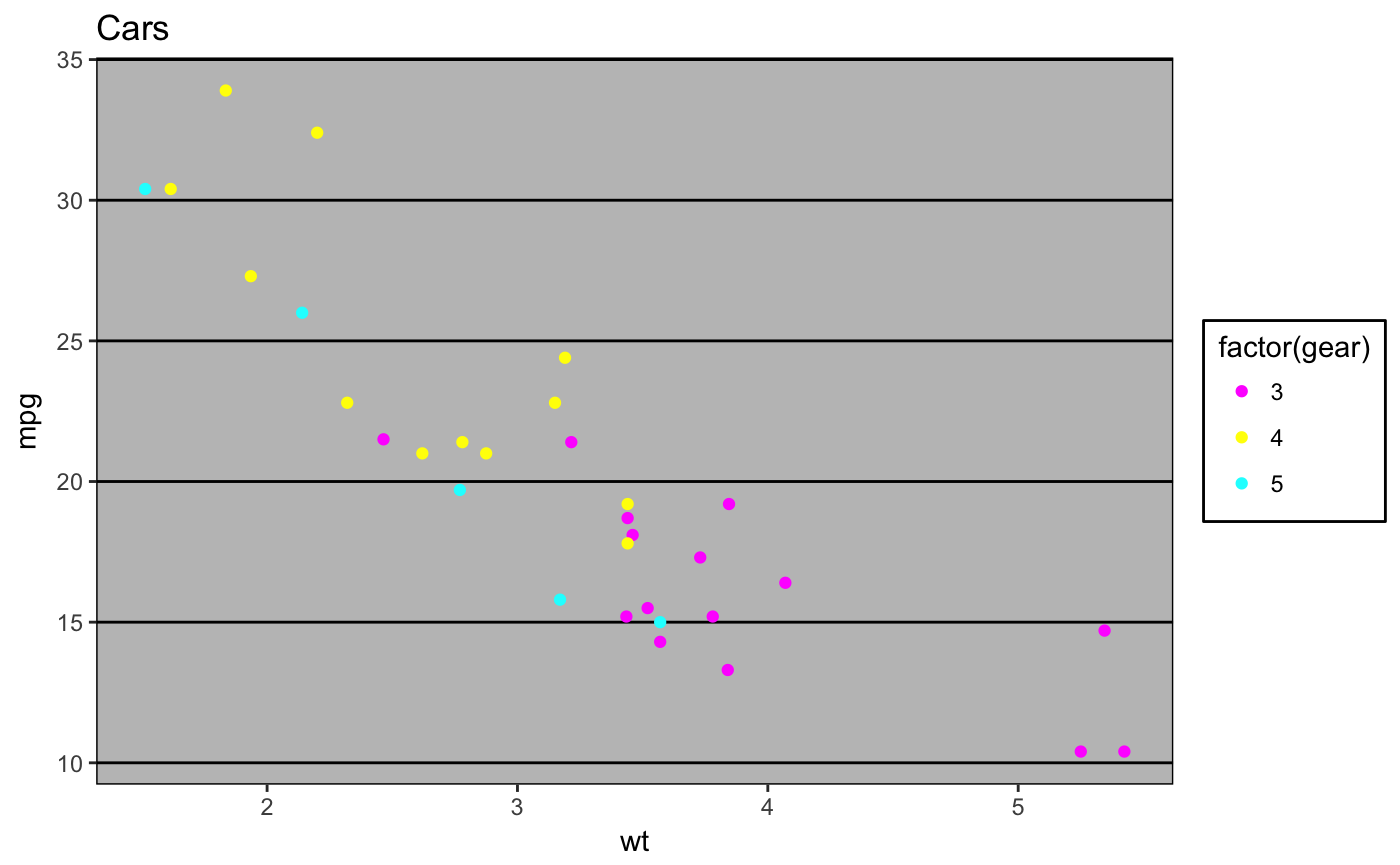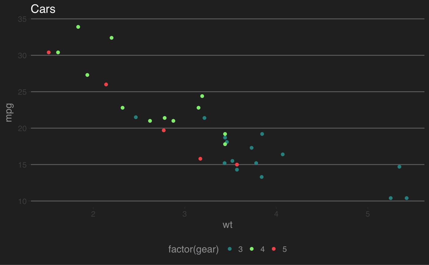 p2 <- ggplot(mtcars, aes(x = wt, y = mpg, colour = factor(gear))) +