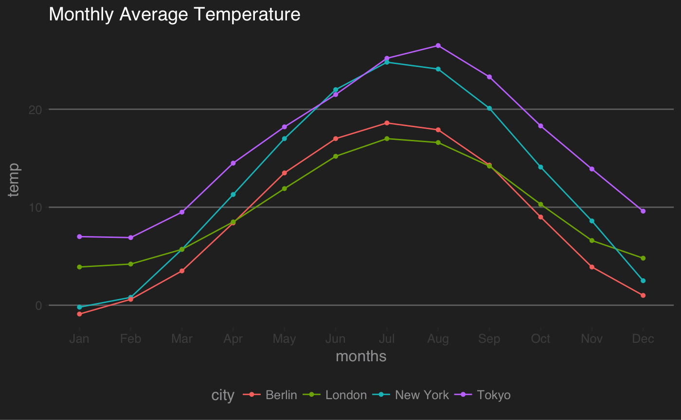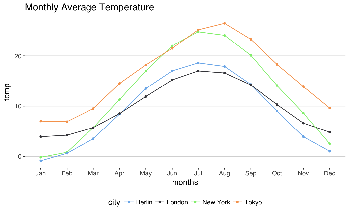 3.9, 4.2, 5.7, 8.5, 11.9, 15.2, 17.0, 16.6, 14.2, 10.3, 6.6, 4.8))ggplot(dtemp, aes(x = months, y = temp, group = city, color = city)) +