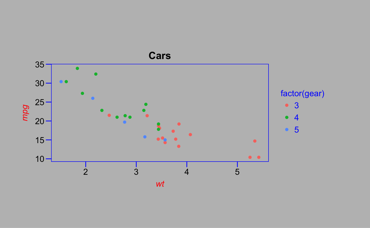 par(fg = "blue", bg = "gray", col.lab = "red", font.lab = 3)