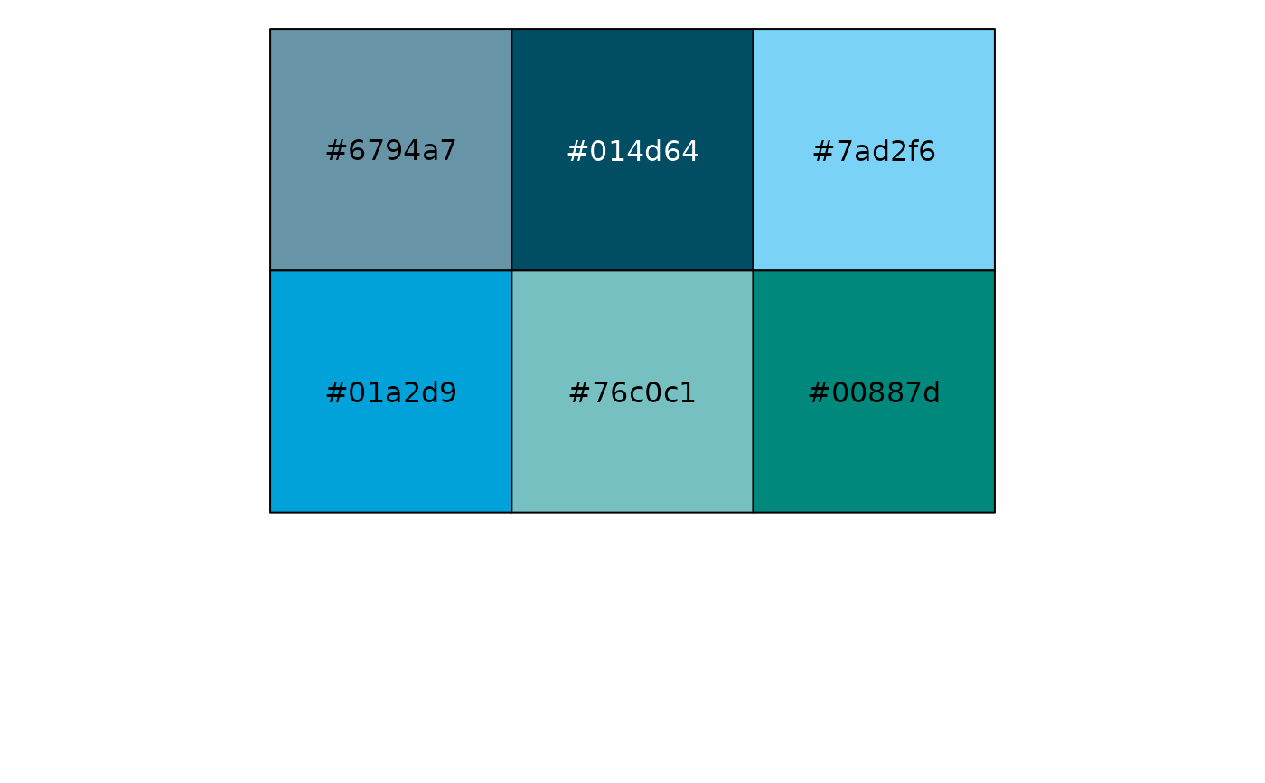 library("scales") show_col(economist_pal()(6)) ## fill palette show_col(economist_pal(fill = TRUE)(6))